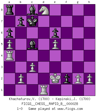 Last move : 1-0 2007 February 25 5:46:31 [Event "FICGS__CHESS__RAPID_B__000028"] [Site "FICGS"] [Date "2006.12.17"] [Round "1"] [White "Khachaturov,Vadim"] [Black "Kepinski,Janusz"] [Result "1-0"] [WhiteElo "1700"] [BlackElo "1700"] 1.d4 e6 2.e4 d5 3.Nc3 Nf6 4.e5 Ne4 5.Nxe4 dxe4 6.Be3 c5 7.dxc5 Nd7 8.Qg4 Nxc5 9.Bxc5 Bxc5 10.Qxg7 Qa5+ 11.c3 Rf8 12.Nh3 e3 13.Bd3 exf2+ 14.Ke2 Bb6 15.Ng5 Qc5 16.Kf1 Kd7 17.Nxh7 Rd8 18.Qxf7+ Kc6 19.Be4+ Kb5 20.Qf3 Qc4+ 21.Qe2 Qxe2+ 22.Kxe2 a6 23.a4+ Kc4 24.Ng5 Kb3 25.Ra3+ Kc4 26.Nf7 Rd5 27.Bxd5+ Kxd5 28.Rd1+ Kc6 29.a5 Bc5 30.Nd8+ Kc7 31.Ra4 1-0 This chess game has been lost on time (started : 2006.12.17 8:59:3) Queen's pawn Player White won this chess game. Follow this game move after move (download)By this measure (on the gap between Fischer & his contemporaries), I consider him the greatest world champion. (Garry Kasparov) Ich verstehe Aljechins Kombinationen ganz gut; aber woher er diese Angriffschancen bekommt und wie er die Eröffnung behandelt das ist für mich ein Buch mit sieben Siegeln. (Rudolf Spielmann) Yo considero que Fischer es uno de los expertos mas grandes de aperturas de siempre. (Keith Hayward) Pour moi, les échecs ne sont pas un jeu mais un art. (Alexandre Alekhine) There are two types of people in this world, good and bad. The good sleep better, but the bad seem to enjoy the waking hours much more. (Woody Allen)