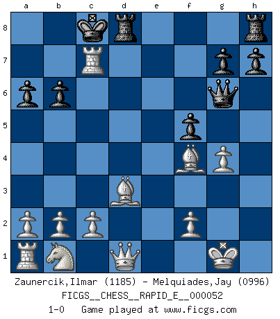 Last move : 1-0 2011 April 18 10:7:10 [Event "FICGS__CHESS__RAPID_E__000052"] [Site "FICGS"] [Date "2011.04.04"] [Round "1"] [White "Zaunercik,Ilmar"] [Black "Melquiades,Jay"] [Result "1-0"] [WhiteElo "1185"] [BlackElo "0996"] 1.e4 e5 2.Nf3 d6 3.d4 Bg4 4.dxe5 a6 5.exd6 Bxd6 6.Be2 Nc6 7.O-O Nf6 8.Re1 Nxe4 9.Bd3 Bxh2+ 10.Kxh2 Qd6+ 11.Kg1 Ne5 12.Rxe4 O-O-O 13.Bf4 Nxf3+ 14.gxf3 Qg6 15.fxg4 f5 16.Re7 b6 17.Rxc7+ 1-0 Philidor's defense Kingside Castling by player White (move 7) Queenside Castling by player Black (move 12) Player White won this chess game. Follow this game move after move (download)The Chess pieces are the block alphabet which shapes thoughts; and these thoughts, although making a visual design on the chessboard, express their beauty abstractly, like a poem. (Marcel Duchamp) Ich moechte nie einem Club beitreten, der Leute wie mich als Mitglieder aufnimmt. (Woody Allen) Nada excita más a Grandes Maestros aburridos que una novedad teórica. (Dominic Lawson) Karpov est une pièce de musée. (Garry Kasparov) Rules and bones are meant to be broken. (Anonymous)