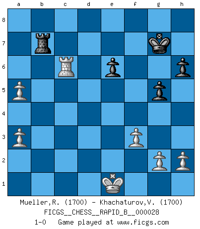 Last move : 1-0 2007 February 1 20:31:4 [Event "FICGS__CHESS__RAPID_B__000028"] [Site "FICGS"] [Date "2006.12.17"] [Round "1"] [White "Mueller,Robert"] [Black "Khachaturov,Vadim"] [Result "1-0"] [WhiteElo "1700"] [BlackElo "1700"] 1.d4 Nf6 2.c4 e6 3.Nf3 d5 4.Nc3 Bb4 5.Bg5 c5 6.e3 Nc6 7.dxc5 h6 8.Bxf6 Qxf6 9.Rc1 O-O 10.a3 Bxc3+ 11.Rxc3 Rd8 12.cxd5 exd5 13.Nd4 Nxd4 14.Qxd4 Qg6 15.Rc1 Bf5 16.f3 Re8 17.Kf2 Qc6 18.Be2 Bd7 19.Rhd1 Qe6 20.b4 a6 21.Bd3 Rad8 22.Rd2 Qe7 23.Qf4 Bc6 24.Re1 Ba4 25.e4 g5 26.Qf5 Qe6 27.Qxe6 fxe6 28.exd5 Rxd5 29.R1e2 Rd7 30.Bg6 Rc8 31.Ke1 Rxd2 32.Rxd2 Kg7 33.Be4 Rc7 34.Rd6 Bd7 35.Bxb7 Rxb7 36.c6 Bxc6 37.Rxc6 a5 38.bxa5 1-0 Queen's pawn game Kingside Castling by player Black (move 9) Player White won this chess game. Follow this game move after move (download)The only thing Chess players have in common is Chess. (Lodewijk Prins) Ich bin Weltmeister und muß mit niemandem irgend etwas diskutieren. (Viswanathan Anand) No es tiempo de jugar al Ajedrez cuando la casa esta en llamas. (Proverbio Italiano) Ce n'est pas pour s'amuser qu'il joue aux échecs : il célèbre un culte. (Vladimir Nabokov) Rules and bones are meant to be broken. (Anonymous)