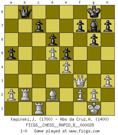 Last move : 1-0 2007 February 26 23:55:44 [Event "FICGS__CHESS__RAPID_B__000028"] [Site "FICGS"] [Date "2006.12.17"] [Round "1"] [White "Kepinski,Janusz"] [Black "Abs da Cruz,Andre"] [Result "1-0"] [WhiteElo "1700"] [BlackElo "1400"] 1.c4 g6 2.d4 Bg7 3.e4 Nc6 4.Nf3 d6 5.d5 Bg4 6.dxc6 bxc6 7.Nc3 Nf6 8.Bd3 e5 9.h3 Bxf3 10.Qxf3 O-O 11.O-O Rb8 12.Rb1 Re8 13.Be3 a5 14.Bc2 Rb7 15.Ba4 Qd7 16.Nd5 Nxd5 17.cxd5 Rb4 18.Bxc6 Qc8 19.Bxe8 Qxe8 20.Rfc1 Qb8 21.Bd2 Rxb2 22.Rxb2 1-0 This chess game has been lost on time (started : 2006.12.17 8:59:3) English Opening Kingside Castling by player Black (move 10) Kingside Castling by player White (move 11) Player White won this chess game. Follow this game move after move (download)Later, I began to succeed in decisive games. Perhaps because I realized a very simple truth: not only was I worried, but also my opponent. (Mikhail Tal) Immer nach dem besten Zug zu suchen ist ziemlich unpraktisch. (Nigel Short) Un buen sacrificio es aquel que aunque no sea necesariamente sólido, deja a tu oponente aturdido y confuso. (Rudolph Spielmann) La victoire dans une partie d'Echecs appartient la plupart du temps à celui qui voit un peu plus loin que l'adversaire. (Lasker) Always two there are. No more no less. A master, and an apprentice. (Master Yoda in Star Wars ep.1)