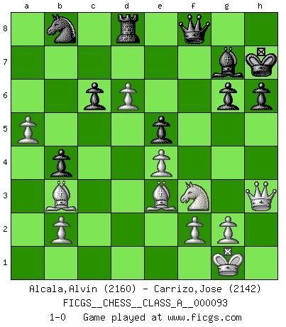 Last move : 1-0 2012 February 15 15:9:51 [Event "FICGS__CHESS__CLASS_A__000093"] [Site "FICGS"] [Date "2011.04.10"] [Round "1"] [White "Alcala,Alvin"] [Black "Carrizo,Jose"] [Result "1-0"] [WhiteElo "2160"] [BlackElo "2142"] 1.e4 d6 2.d4 Nf6 3.Nc3 g6 4.Be3 c6 5.Qd2 b5 6.Bd3 Nbd7 7.Nf3 e5 8.dxe5 dxe5 9.h3 Bb7 10.O-O Bg7 11.a4 a6 12.Ne2 Qe7 13.Ng3 O-O 14.c4 b4 15.c5 a5 16.Qc2 Rfd8 17.Bc4 h6 18.Rfd1 Nf8 19.Rac1 Qc7 20.h4 Rxd1+ 21.Rxd1 Bc8 22.Rd6 Ne8 23.Rd3 Be6 24.h5 Kh7 25.hxg6+ fxg6 26.Nf1 Bc8 27.Ba2 Qe7 28.N1d2 Be6 29.Nc4 Ra6 30.Bb3 Ra7 31.Rd6 Rc7 32.Qd3 Nd7 33.Rxe6 Qxe6 34.Nxa5 Qf6 35.Nc4 Qf8 36.Nd6 Ra7 37.Qc4 Nxd6 38.cxd6 Ra8 39.Qe6 Rd8 40.a5 Nb8 41.Qh3 1-0 Pirc : 150 attack Kingside Castling by player White (move 10) Kingside Castling by player Black (move 13) Player White won this chess game. Follow this game move after move (download)A chess genius has died; a loss for humanity. (Viktor Kortchnoi, about Bobby Fischer's death) Meine Liebe ist Schach, Schach, Schach. Ich muss jeden Tag Schach spielen, deshalb fühle ich mich so stark. (Miguel Najdorf) Bendita sea la memoria de aquel que dio al mundo este juego inmortal. (A. G. Gardiner) Les échecs sont utiles à l'exercice de la faculté de penser et à celle de l'imagination. Car nous devons posséder une méthode élaborée pour atteindre des buts partout où nous devons conduire notre raison. (Leibnitz) Hold em is to stud what chess is to checkers. (Johnny Moss)