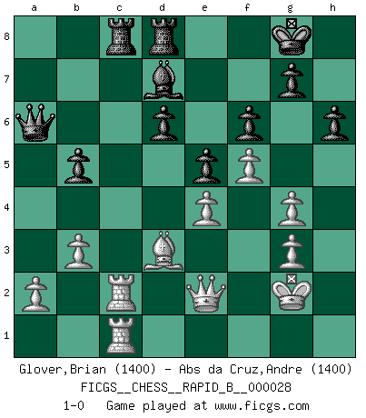 Last move : 1-0 2007 February 24 23:45:41 [Event "FICGS__CHESS__RAPID_B__000028"] [Site "FICGS"] [Date "2006.12.17"] [Round "1"] [White "Glover,Brian"] [Black "Abs da Cruz,Andre"] [Result "1-0"] [WhiteElo "1400"] [BlackElo "1400"] 1.e4 c5 2.Nf3 Nc6 3.g3 e6 4.d4 cxd4 5.Nxd4 Nxd4 6.Qxd4 Nf6 7.Bg2 Qc7 8.Nc3 Bc5 9.Qd3 O-O 10.Bf4 e5 11.Bg5 Qb6 12.O-O h6 13.Bc1 Ng4 14.Nd1 Re8 15.h3 Nf6 16.Be3 Bxe3 17.Qxe3 Qc6 18.Qd3 Rd8 19.Ne3 d6 20.f4 Be6 21.f5 Bd7 22.b3 b5 23.Rf2 Bc8 24.Rc1 Bd7 25.Ng4 Nxg4 26.hxg4 f6 27.Bf1 a6 28.Qe3 a5 29.Bd3 a4 30.Kg2 axb3 31.cxb3 Qa6 32.Rfc2 Rac8 33.Qe2 1-0 This chess game has been lost on time (started : 2006.12.17 8:59:3) Sicilian defense Kingside Castling by player Black (move 9) Kingside Castling by player White (move 12) Player White won this chess game. Follow this game move after move (download)All I want to do, ever, is just play Chess. (Bobby Fischer) Ich habe die Schachforschung dermaßen betrieben, dass sie auf eine wissenschaftliche Basis gestellt wurde. (Mikhail Moiseyevich Botvinik) El ganador de una partida es aquel jugador que hace el penúltimo error. (Savielly Tartakover) L'action d'une oeuvre littéraire se déroule sur un champ de bataille. Les masques et les types du drame moderne correspondent aux pièces du jeu d'échecs. L'intrigue correspond aux coups et aux gambits, c'est à dire aux techniques du jeu telles qu'utilisées et interprétées par les joueurs. Les tactiques et les péripéties [mouvements] correspondent aux coups exécutés par l'adversaire. (Viktor Shklovsky) An expert is a man who has made all the mistakes which can be made in a very narrow field. (Niels Bohr)