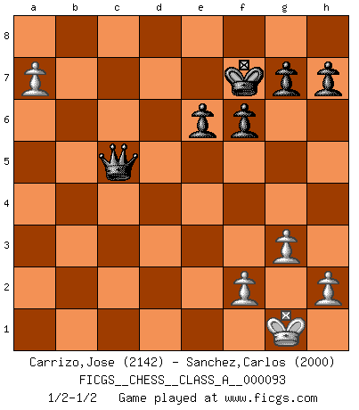 Last move : 1/2-1/2 2011 December 7 23:54:39 [Event "FICGS__CHESS__CLASS_A__000093"] [Site "FICGS"] [Date "2011.04.10"] [Round "1"] [White "Carrizo,Jose"] [Black "Sanchez,Carlos"] [Result "1/2-1/2"] [WhiteElo "2142"] [BlackElo "2000"] 1.e4 c5 2.c3 Nf6 3.e5 Nd5 4.d4 cxd4 5.Nf3 Nc6 6.Bc4 Nb6 7.Bb3 d5 8.exd6 Qxd6 9.O-O Be6 10.Na3 dxc3 11.Qe2 Bxb3 12.Nb5 Qb8 13.axb3 e6 14.bxc3 Be7 15.g3 Qc8 16.Bf4 Nd5 17.Nd6+ Bxd6 18.Bxd6 Qd8 19.Bc5 Nxc3 20.Qc4 Qf6 21.Rfc1 Qxf3 22.Rxc3 Qd5 23.Qa4 Rd8 24.b4 f6 25.b5 Ne5 26.b6 Kf7 27.bxa7 Nf3+ 28.Rxf3 Qxf3 29.Rb1 b5 30.Qxb5 Rd1+ 31.Rxd1 Qxd1+ 32.Kg2 Qd5+ 33.Kg1 Rc8 34.Qb4 Rxc5 35.Qxc5 Qxc5 1/2-1/2 Sicilian : Alapin's variation (2.c3) Kingside Castling by player White (move 9) This chess game ended in a draw. Follow this game move after move (download)Chess is really ninety nine percent calculation. (Soltis) Gott hat gewollt, dass ich Champion werde. (Surab Azmajparaschvili) Aquellos que dicen que entienden al Ajedrez, no entienden nada. (Robert Hubner) La solitude du joueur d'Echecs à l'approche du mat est semblable à celle du condamné. (Francis Szpiner) Happy endings are just stories that haven't finished yet. (Jane Smith in Mr & Mrs Smith)
