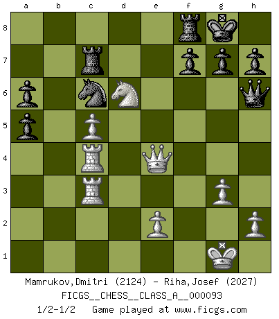 Last move : 1/2-1/2 2011 May 17 17:27:11 [Event "FICGS__CHESS__CLASS_A__000093"] [Site "FICGS"] [Date "2011.04.10"] [Round "1"] [White "Mamrukov,Dmitri"] [Black "Riha,Josef"] [Result "1/2-1/2"] [WhiteElo "2124"] [BlackElo "2027"] 1.d4 Nf6 2.c4 e6 3.g3 Bb4+ 4.Bd2 Be7 5.Nf3 d5 6.Bg2 O-O 7.O-O c6 8.Qc2 b6 9.Bf4 Bb7 10.Rd1 Nbd7 11.b3 c5 12.Nc3 dxc4 13.bxc4 cxd4 14.Rxd4 Bc5 15.Rd2 Qc8 16.Nb5 e5 17.Nxe5 Nxe5 18.Bxe5 Bxf2+ 19.Kxf2 Ng4+ 20.Kg1 Nxe5 21.Bxb7 Qxb7 22.Nd6 Qe7 23.Qe4 Rad8 24.Rad1 Qe6 25.a4 Rd7 26.a5 bxa5 27.c5 Rc7 28.Rc1 a6 29.Rd4 Qh6 30.Rc3 Nc6 31.Rdc4 1/2-1/2 Catalan Opening Kingside Castling by player Black (move 6) Kingside Castling by player White (move 7) This chess game ended in a draw. Follow this game move after move (download)A sacrifice is best refuted by accepting it. (Wilhelm Steinitz) Es macht mich traurig, wenn ich sehe, dass Golfprofis mehr verdienen als Schachsportler. Obwohl ich davon überzeugt bin, dass wir Schachspieler viel härter trainieren müssen als die Golfer. (Alexandra Kosteniuk) El sobresalir en el Ajedrez es un signo de una mente intrigante. (Sir Arthur Conan Doyle) Ce qui est bien, c'est d'avoir tout un tas de pièces en prise : l'adversaire ne peut en prendre qu'une à la fois. Cité par Thierry Audin. Methinks King Thibault should dub Marius Zubac a knight of the square board... I mean table, henceforth addressing him as Sir Marius, and bestow on him a suitable land from the kingdom of FICGS & marry him off to a worthy, fair maiden, lest he slice our heads with his mighty sword in his wrath. (Dinesh De Silva)