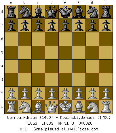 Last move : 0-1 2007 January 16 12:27:52 [Event "FICGS__CHESS__RAPID_B__000028"] [Site "FICGS"] [Date "2006.12.17"] [Round "1"] [White "Cornea,Adrian"] [Black "Kepinski,Janusz"] [Result "0-1"] [WhiteElo "1400"] [BlackElo "1700"] 0-1 This chess game has been lost on time (started : 2006.12.17 8:59:3) Player Black won this chess game. Follow this game move after move (download)Chess holds its master in its own bonds, shackling the mind and brain so that the inner freedom of the very strongest must suffer. (Albert Einstein) Die Idee von Capablanca, Schach als Fach in den Schulen zu lehren, ist großartig. (Fidel Castro) Haz el enroque temprano y seguido. (Rob Sillars) A ce moment-là, je menaçais de comprendre la position ! (Clément L'Heureux) Happy endings are just stories that haven't finished yet. (Jane Smith in Mr & Mrs Smith)