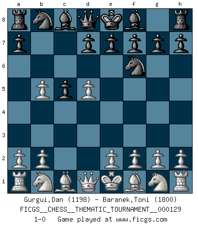 Last move : 1-0 2011 May 26 6:44:44 [Event "FICGS__CHESS__THEMATIC_TOURNAMENT__000129"] [Site "FICGS"] [Date "2011.04.12"] [Round "1"] [White "Gurgui,Dan"] [Black "Baranek,Toni"] [Result "1-0"] [WhiteElo "1198"] [BlackElo "1800"] 1.d4 Nf6 2.c4 c5 3.d5 b5 4.cxb5 1-0 This chess game has been lost on time (started : 2011.04.12 1:33:8) Benko gambit Player White won this chess game. Follow this game move after move (download)The passed Pawn is a criminal, who should be kept under lock and key. Mild measures, such as police surveillance, are not sufficient. (Aaron Nimzovich) Pläne sind die Träume des Verständigen. (Ernst Freiherr von Feuchtersleben) Yo creo que el Ajedrez posee una magia que es también una ayuda en la edad avanzada. Una rodilla reumática es olvidada durante una partida de Ajedrez y otros eventos pueden parecer algo sin importancia comparada a una catástrofe en el tablero de Ajedrez. (Vlastimil Hort) Le joueur d'Echecs qui veut atteindre le top est obligé de développer son propre credo créatif. Alexeï Stepanovicth Souétine. Il est facile d'écrire des livres ! Ce qui est difficile, c'est de jouer ! (Alexeï Stepanovicth Souétine) SEO proverb : Make your website optimized for human beings, not for search engines.