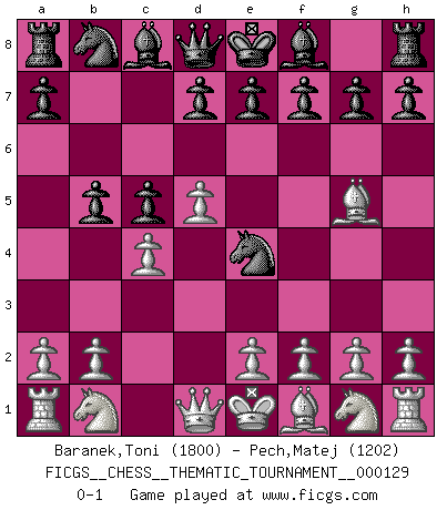 Last move : 0-1 2011 July 1 8:11:12 [Event "FICGS__CHESS__THEMATIC_TOURNAMENT__000129"] [Site "FICGS"] [Date "2011.04.12"] [Round "1"] [White "Baranek,Toni"] [Black "Pech,Matej"] [Result "0-1"] [WhiteElo "1800"] [BlackElo "1202"] 1.d4 Nf6 2.c4 c5 3.d5 b5 4.Bg5 Ne4 0-1 This chess game has been lost on time (started : 2011.04.12 1:33:8) Benko gambit Player Black won this chess game. Follow this game move after move (download)The defensive power of a pinned piece is only imaginary. (Aaron Nimzovich) Ivan Sokolov treibt mich als Beifahrer an mit go Loeky go - . (Loek van Wely) Personalmente, yo prefiero mirar hacia el futuro en donde un programa de computadora gane el título mundial de Ajedrez. La humanidad necesita una lección de humildad. (Richard Dawkings) Je ne suis pas le dernier à jouer lâchement des coups douteux pendant le zeïtnot de l'adversaire pour l'achever: en effet les coups qui font le plus peur sont ceux que l'on ne comprend pas. Je me fais souvent peur quand je joue. (Un professeur anonyme) Memory... is the diary that we all carry with us. (Oscar Wilde, The Importance of Being Earnest)