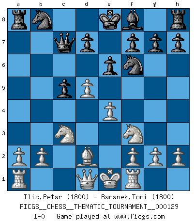 Last move : 1-0 2011 May 25 6:45:56 [Event "FICGS__CHESS__THEMATIC_TOURNAMENT__000129"] [Site "FICGS"] [Date "2011.04.12"] [Round "1"] [White "Ilic,Petar"] [Black "Baranek,Toni"] [Result "1-0"] [WhiteElo "1800"] [BlackElo "1800"] 1.d4 Nf6 2.c4 c5 3.d5 b5 4.cxb5 Qa5+ 5.Nc3 a6 6.bxa6 Bxa6 7.Bd2 Qc7 8.Nf3 e6 9.e4 Bxf1 10.Rxf1 1-0 This chess game has been lost on time (started : 2011.04.12 1:33:8) Benko gambit Player White won this chess game. Follow this game move after move (download)The way he plays Chess demonstrates a man's whole nature. (Stanley Ellin) Als ich elf wurde, wurde ich einfach gut. (Robert James Fischer) No todos los artistas son jugadores de Ajedrez, pero todos los jugadores de Ajedrez son artistas. (Marcel Duchamp) Les échecs sont un jeu terrible. Si vous n'avez pas le centre, votre adversaire a une position plus libre. Par contre, si vous avez le centre, alors vous avez vraiment quelque chose pour laquelle vous inquiéter ! (Siegbert Tarrasch) God is an atheist. (Unknown)