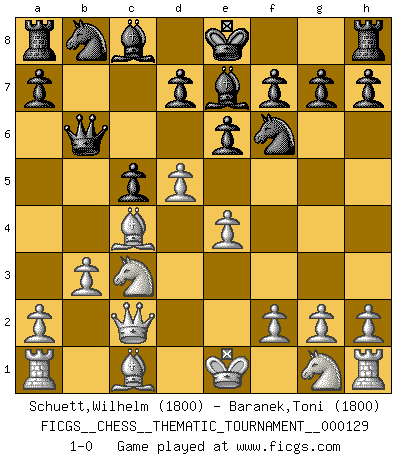 Last move : 1-0 2011 May 28 18:51:33 [Event "FICGS__CHESS__THEMATIC_TOURNAMENT__000129"] [Site "FICGS"] [Date "2011.04.12"] [Round "1"] [White "Schuett,Wilhelm"] [Black "Baranek,Toni"] [Result "1-0"] [WhiteElo "1800"] [BlackElo "1800"] 1.d4 Nf6 2.c4 c5 3.d5 b5 4.Qc2 bxc4 5.e4 e6 6.Bxc4 Qb6 7.b3 Be7 8.Nc3 1-0 This chess game has been lost on time (started : 2011.04.12 1:33:8) Benko gambit Player White won this chess game. Follow this game move after move (download)Bobby Fischer's current state of mind is indeed a tragedy. One of the world's greatest Chess players - the pride and sorrow of American Chess. (Frank Brady) Woher wissen wir, daß der Neanderthaler Blindschach gespielt hat? -- Bei Ausgrabungen wurden keine Schachbretter und Figuren gefunden. (Anonymous) Una buena ofensiva y una buena defensa, comienzan ambas con un buen desarrollo. (Bruce A. Moon) Nous vivons dans un monde échiquéen : chaque jour qui passe est un défi à relever. (Philosophe Sasha) We're missing something. (Gregory House, House M.D.)
