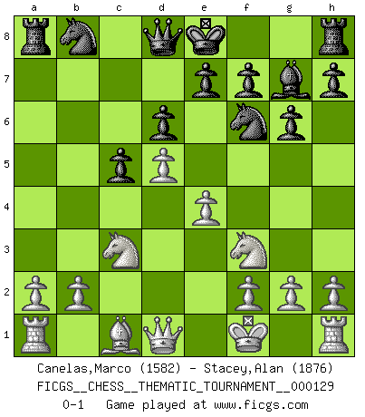 Last move : 0-1 2011 May 25 6:45:56 [Event "FICGS__CHESS__THEMATIC_TOURNAMENT__000129"] [Site "FICGS"] [Date "2011.04.12"] [Round "1"] [White "Canelas,Marco"] [Black "Stacey,Alan"] [Result "0-1"] [WhiteElo "1582"] [BlackElo "1876"] 1.d4 Nf6 2.c4 c5 3.d5 b5 4.cxb5 a6 5.bxa6 Bxa6 6.Nc3 d6 7.e4 Bxf1 8.Kxf1 g6 9.Nf3 Bg7 0-1 This chess game has been lost on time (started : 2011.04.12 1:33:8) Benko gambit : 7.e4 Player Black won this chess game. Follow this game move after move (download)One doesn't have to play well, it's enough to play better than your opponent. (Siegbert Tarrasch) Ein Gewinn durch eine ungenaue Kombination, sei sie auch noch so vorzeigbar, erfüllt mich mit Schaudern. (Wilhelm Steinitz) No hay otro maestro que tenga una voluntad terrífica de ganar. Al tablero, el irradía peligro y aún los oponentes mas fuertes tienden a congelarse como liebres cuando olfatean a una pantera. Aún sus debilidades son peligrosas. Con las blancas, su juego de apertura es predecible - te es posible hacer planes en su contra - pero es tan fuerte que tus planes casi nunca funcionan. En el juego medio, su precisión e invención son fabulosas y en finales, tú simplemente no le puedes vencer. (Experto Alemán anónimo) Ne tendez aucun piège pour le plaisir ! Ne jouez rien dans l'espoir que l'adversaire réagisse de façon stupide ! Prenez toujours pour acquis que l'adversaire va trouver le meilleur coup ! Ne jouez jamais de coup dans l'espoir que l'adversaire ne voie pas la menace ! Chacun de vos coups doit améliorer la position d'une façon ou d'une autre. The beginning of wisdom is silence. The second step is listening. (Unknown)