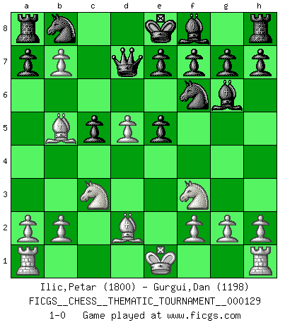 Last move : 1-0 2011 May 4 19:31:12 [Event "FICGS__CHESS__THEMATIC_TOURNAMENT__000129"] [Site "FICGS"] [Date "2011.04.12"] [Round "1"] [White "Ilic,Petar"] [Black "Gurgui,Dan"] [Result "1-0"] [WhiteElo "1800"] [BlackElo "1198"] 1.d4 Nf6 2.c4 c5 3.d5 b5 4.cxb5 d6 5.Nc3 Qa5 6.Bd2 Bf5 7.e4 Bg6 8.Nf3 Qc7 9.Qa4 Qd7 10.e5 dxe5 11.b6 Qxa4 12.b7 Qd7 13.Bb5 1-0 Benko gambit Player White won this chess game. Follow this game move after move (download)A bad plan is better than none at all. (Frank Marshall) Dein Körper muss in Topform sein. Dein Schach verfällt, wenn dein Körper verfällt. Der Körper kann nicht vom Geist getrennt werden. (Robert James Fischer) Es muy difícil jugar en contra de la teoría de Einstein. - en su primera derrota en contra de Fischer (Mikhail Tal) Les Echecs sont et restent toujours un combat, un combat intégral comme la boxe, la lutte ou un autre sport, et où il doit y avoir un vainqueur et un vaincu. (Joseph Emil Diemer) He who laughs last probably does not get the joke. (Unknown)