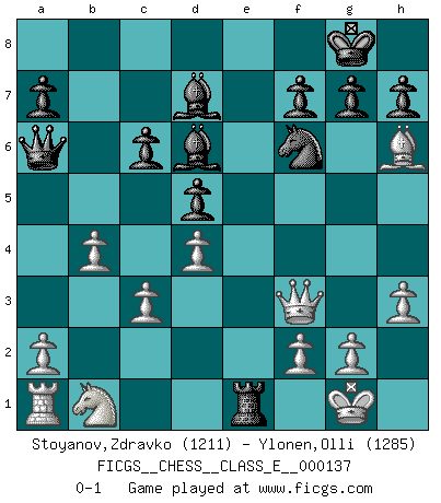 Last move : 0-1 2011 May 23 6:31:57 [Event "FICGS__CHESS__CLASS_E__000137"] [Site "FICGS"] [Date "2011.04.12"] [Round "1"] [White "Stoyanov,Zdravko"] [Black "Ylonen,Olli"] [Result "0-1"] [WhiteElo "1211"] [BlackElo "1285"] 1.e4 c6 2.Nf3 d5 3.exd5 cxd5 4.h3 Nf6 5.c3 Bf5 6.Be2 Nc6 7.Bb5 Qb6 8.Nd4 Bd7 9.Bxc6 bxc6 10.O-O e5 11.Nf3 Bd6 12.d4 e4 13.Re1 O-O 14.b4 exf3 15.Qxf3 Rfe8 16.Bd2 Rxe1+ 17.Bxe1 Re8 18.Bd2 Qa6 19.Bh6 Re1+ 0-1 Caro-Kann defense Kingside Castling by player White (move 10) Kingside Castling by player Black (move 13) Player Black won this chess game. Follow this game move after move (download)Daring ideas are like Chess men moved forward. They may be beaten, but they may start a winning game. (Johann Wolfgang von Goethe) Schach sollte überall auf der Welt Schulfach werden. Es fördert die geistige Auseinandersetzung. Es lehrt die Demut in der Niederlage. (Garry Kasparov) Los Peones son el alma de una partida de Ajedrez. (Francois Andre Danican Philidor) Les Echecs mettent en conflit, non pas deux intelligences, mais deux volontés. (Lasker) Optimism is a variety of information deficit. Sometimes especially true for correspondence chess games. (Michael Aigner)