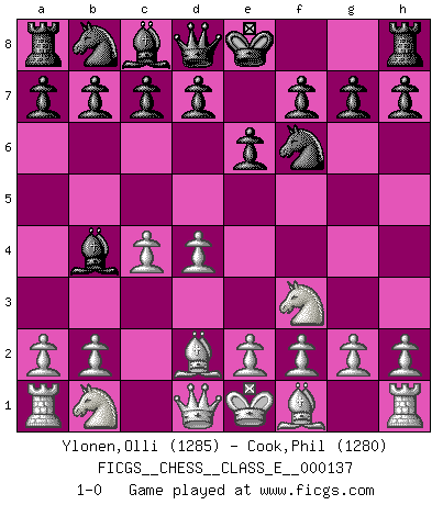 Last move : 1-0 2011 May 25 18:45:21 [Event "FICGS__CHESS__CLASS_E__000137"] [Site "FICGS"] [Date "2011.04.12"] [Round "1"] [White "Ylonen,Olli"] [Black "Cook,Phil"] [Result "1-0"] [WhiteElo "1285"] [BlackElo "1280"] 1.d4 Nf6 2.Nf3 e6 3.c4 Bb4+ 4.Bd2 1-0 This chess game has been lost on time (started : 2011.04.12 10:11:3) Queen's pawn game Player White won this chess game. Follow this game move after move (download)I won't play with you anymore. You have insulted my friend. - When an opponent cursed himself for a blunder. (Miguel Najdorf) Karpov ist ein Museumsstück. (Garry Kasparov) Una victoria por una combinación errónea, aunque sea espectacular, me llena de horror artístico. (Wilhelm Steinitz) Echiquier : carré parfait, comme la Jérusalem nouvelle décrite par l'auteur de l'Apocalypse, huit cases sur huit, exaltation du chiffre 4, symbole du cosmos aux quatre horizons... où le noir et le blanc, l'ombre et la lumière, le mal et le bien s'entremêlent et se conjuguent. (Robert Couffignal, Le Gambit du poète) If only people were all showed a certain minimum level of niceness; if only people didn't retract verbal draw offers (without draw box ticked) on ficgs; if only people didn't kill; if only people didn't run concentration / extermination camps, if only people didn't drop nuclear bombs on Hiroshima and Nagasaki, and so on - it would be a much more beautiful world. But sadly, things are not so... (Normajean Yates)