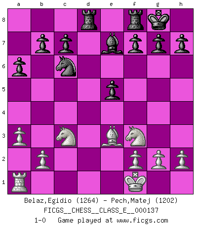 Last move : 1-0 2011 August 24 12:51:28 [Event "FICGS__CHESS__CLASS_E__000137"] [Site "FICGS"] [Date "2011.04.12"] [Round "1"] [White "Belaz,Egidio"] [Black "Pech,Matej"] [Result "1-0"] [WhiteElo "1264"] [BlackElo "1202"] 1.e4 e5 2.Nf3 Nc6 3.d3 Nf6 4.Bg5 Be7 5.Be2 d5 6.exd5 Nxd5 7.Bd2 O-O 8.O-O Be6 9.c4 Ndb4 10.a3 Nxd3 11.Bxd3 Qxd3 12.Be3 Bxc4 13.Qxd3 Bxd3 14.Nc3 Bxf1 15.Kxf1 Rad8 16.Nb5 a6 17.Nc3 1-0 This chess game has been lost on time (started : 2011.04.12 10:11:3) King's pawn game Kingside Castling by player Black (move 7) Kingside Castling by player White (move 8) Player White won this chess game. Follow this game move after move (download)There is only one thing Fischer does in Chess without pleasure: to lose ! (Boris Spassky) Zu meiner Zeit war ein 20 jähriger ein junger Spieler, heute ist er ein Veteran. (Garry Kasparov) Las Aperturas te enseñan aperturas. ¡Los Finales te enseñan Ajedrez!. (Stephan Gerzadowicz) Ne tendez aucun piège pour le plaisir ! Ne jouez rien dans l'espoir que l'adversaire réagisse de façon stupide ! Prenez toujours pour acquis que l'adversaire va trouver le meilleur coup ! Ne jouez jamais de coup dans l'espoir que l'adversaire ne voie pas la menace ! Chacun de vos coups doit améliorer la position d'une façon ou d'une autre. However beautiful the strategy, you should occasionally look at the results. (Winston Churchill)