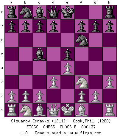 Last move : 1-0 2011 May 23 6:44:5 [Event "FICGS__CHESS__CLASS_E__000137"] [Site "FICGS"] [Date "2011.04.12"] [Round "1"] [White "Stoyanov,Zdravko"] [Black "Cook,Phil"] [Result "1-0"] [WhiteElo "1211"] [BlackElo "1280"] 1.e4 e5 2.Nf3 Nf6 3.d3 Bc5 4.h3 1-0 This chess game has been lost on time (started : 2011.04.12 10:11:3) Petrov's defense Player White won this chess game. Follow this game move after move (download)If one piece is badly posted, the whole game is bad. (Tarrasch) Früher wurde jeder komplizierte Zug, jedes interessante Opfer mit großem Beifall und Enthusiasmus aufgenommen. Heute schaltet man einfach seinen Fritz an, und man kann sehen, was los ist, ob der Zug geht oder nicht. (Vladimir Kramnik) Bobby es el jugador de Ajedrez mas fino que este país jamás haya producido. Su memoria para las movidas, su brillantez en soñar combinaciones y su feróz determinación por la victoria son algo extraño. (John Collins) 'L'échange des dames est un coup dur pour les deux adversaires...' Un journaliste lors d'une partie du match Spassky-Fischer Always remember that you are unique; just like everyone else. (Unknown)
