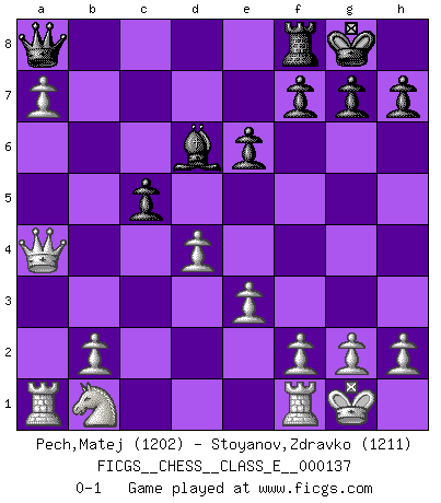 Last move : 0-1 2011 August 23 21:58:57 [Event "FICGS__CHESS__CLASS_E__000137"] [Site "FICGS"] [Date "2011.04.12"] [Round "1"] [White "Pech,Matej"] [Black "Stoyanov,Zdravko"] [Result "0-1"] [WhiteElo "1202"] [BlackElo "1211"] 1.d4 d5 2.c4 dxc4 3.Nf3 e6 4.e3 b5 5.a4 Bd7 6.Ne5 Nc6 7.Nxd7 Qxd7 8.axb5 Nb4 9.Bxc4 a6 10.bxa6 Ne7 11.Bd2 Nec6 12.Qa4 Bd6 13.O-O O-O 14.Bxb4 Bxb4 15.Bb5 Bd6 16.Bxc6 Qc8 17.Bxa8 Qxa8 18.a7 c5 0-1 This chess game has been lost on time (started : 2011.04.12 10:11:3) QGA : 3.Nf3 Kingside Castling by player White (move 13) Kingside Castling by player Black (move 13) Player Black won this chess game. Follow this game move after move (download)Spassky will not be psyched out by Fischer. (Mike Goodall) Die Leute spielen gegen mich seit 15 Jahren unter Ihren Möglichkeiten. (Robert James Fischer) Fischer es el jugador mas fuerte del mundo. De hecho, el jugador mas fuerte que jamas haya existido. (Larry Evans) Les échecs, c'est l'imagination. (David Bronstein) Every man's memory is his private literature. (Aldous Huxley)