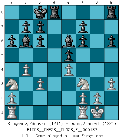 Last move : 1-0 2011 July 4 8:12:37 [Event "FICGS__CHESS__CLASS_E__000137"] [Site "FICGS"] [Date "2011.04.12"] [Round "1"] [White "Stoyanov,Zdravko"] [Black "Dups,Vincent"] [Result "1-0"] [WhiteElo "1211"] [BlackElo "1221"] 1.e4 e5 2.Nf3 Nc6 3.Bb5 a6 4.Bxc6 dxc6 5.h3 Be6 6.d3 Bc5 7.O-O Qd6 8.c3 O-O-O 9.b4 Bb6 10.Na3 Nf6 11.Bg5 h6 12.Bxf6 gxf6 13.Nh4 Qxd3 14.Qf3 Qxf3 15.Nxf3 1-0 This chess game has been lost on time (started : 2011.04.12 10:11:3) Ruy Lopez : Exchange variation Kingside Castling by player White (move 7) Queenside Castling by player Black (move 8) Player White won this chess game. Follow this game move after move (download)Chess is as much a mystery as women. (Purdy) Eine Person mit durchschnittlichem IQ kann etwa eine ELO von 2000 erreichen. (Jonathan Levitt) No es suficiente ser un buen jugador, se debe también de jugar bién. (Siegbert Tarrasch) Les échecs sont un jeu par leur forme, un art par leur essence et une science par sa difficulté d'acquisition. Ils peuvent vous procurer autant de plaisir qu'un bon livre ou une belle musique, mais vous n'aurez une réelle joie que si vous arrivez à bien jouer. (Tigran Petrosian) If we don't succeed, we run the risk of failure. (George W. Bush)