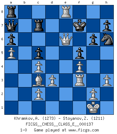 Last move : 1-0 2011 June 15 9:41:15 [Event "FICGS__CHESS__CLASS_E__000137"] [Site "FICGS"] [Date "2011.04.12"] [Round "1"] [White "Khramkov,Alexey"] [Black "Stoyanov,Zdravko"] [Result "1-0"] [WhiteElo "1273"] [BlackElo "1211"] 1.e4 c5 2.Nc3 a6 3.a4 Nc6 4.f4 e6 5.Bc4 Nge7 6.Nf3 g6 7.O-O Bg7 8.d3 Na5 9.Ba2 O-O 10.Nh4 Nec6 11.Qg4 Nd4 12.Bb1 f5 13.exf5 exf5 14.Qg3 Nac6 15.Nf3 b6 16.Be3 Ne6 17.Ba2 Nb4 18.Qf2 Bxc3 19.Bxe6+ dxe6 20.bxc3 Nd5 21.Bd2 Bb7 22.c4 Nf6 23.Bc3 Ng4 24.Qe2 Bxf3 25.Qxe6+ Rf7 26.Rxf3 Qh4 27.h3 Nh6 28.Qxb6 Qe7 29.Re1 Qd7 30.a5 Qa7 31.Re6 Rb7 32.Qc6 Rc7 33.Re8+ Kf7 34.Qe6+ 1-0 Sicilian : Closed Kingside Castling by player White (move 7) Kingside Castling by player Black (move 9) Player White won this chess game. Follow this game move after move (download)There are two classes of men; those who are content to yield to circumstances and who play whist; those who aim to control circumstances, and who play Chess. (Mortimer Collins) Strategie ist, wie man ein Mädchen auf den Rücksitz bekommt. Taktik ist, was man tut, wenn man dann dort ist. (Anonymous) La señal de un Gran Maestro es su habilidad de ganar una partida rápidamente y sin dolor. (Irving Chernev) Les sacrifices démontrent seulement que quelqu'un a gaffé. (Savielly Tartacover) The real voyage of discovery consists not in seeking new lands but in seeing with new eyes. (Marcel Proust)