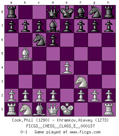 Last move : 0-1 2011 May 23 18:43:37 [Event "FICGS__CHESS__CLASS_E__000137"] [Site "FICGS"] [Date "2011.04.12"] [Round "1"] [White "Cook,Phil"] [Black "Khramkov,Alexey"] [Result "0-1"] [WhiteElo "1280"] [BlackElo "1273"] 1.e4 Nc6 2.Nf3 d6 3.Bb5 Bd7 0-1 This chess game has been lost on time (started : 2011.04.12 10:11:3) KP : Nimzovich defense Player Black won this chess game. Follow this game move after move (download)By playing at Chess then, we may learn: First: Foresight... Second: Circumspection... Third: Caution... And lastly, we learn by Chess the habit of not being discouraged by present bad appearances in the state of our affairs, the habit of hoping for a favorable chance, and that of persevering in the secrets of resources. (Benjamin Franklin) Der zweitbeste Zug ist oft der einzig richtige. (Savielly Grigorievitsch Tartakower) Una compensación adecuada por un sacrificio es tener una combinación sólida que conduce a una posición ganadora; una compensación adecuada por una metida de pata es dejar a tu oponente arrebatar una derrota de las fauces de la victoria. (Bruce A. Moon) La victoire dans une partie d'Echecs appartient la plupart du temps à celui qui voit un peu plus loin que l'adversaire. (Lasker) Now be brave and don't look back. Don't look back. (Shmi Skywalker in Star Wars ep.1)