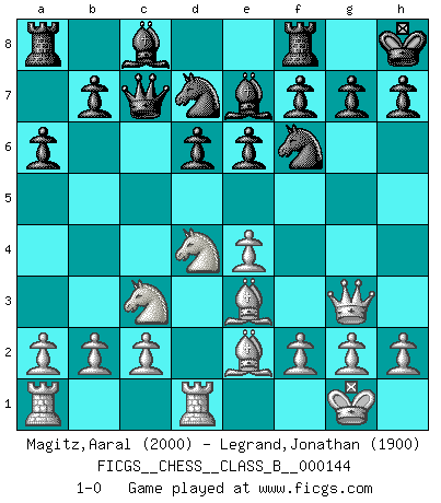 Last move : 1-0 2011 July 25 8:45:45 [Event "FICGS__CHESS__CLASS_B__000144"] [Site "FICGS"] [Date "2011.04.13"] [Round "1"] [White "Magitz,Aaral"] [Black "Legrand,Jonathan"] [Result "1-0"] [WhiteElo "2000"] [BlackElo "1900"] 1.e4 c5 2.Nf3 d6 3.d4 cxd4 4.Nxd4 Nf6 5.Nc3 a6 6.Bc4 e6 7.O-O Be7 8.Be3 O-O 9.Qf3 Nbd7 10.Be2 Qc7 11.Qg3 Kh8 12.Rfd1 1-0 This chess game has been lost on time (started : 2011.04.13 10:36:59) Sicilian : Najdorf, Lipnitzky attack Kingside Castling by player White (move 7) Kingside Castling by player Black (move 8) Player White won this chess game. Follow this game move after move (download)The Pin is mightier than the sword. (Fred Reinfeld) Versuche, dich von der Sklaverei der Eröffnungsvarianten zu befreien. Stattdessen soll man gewisse Typenpositionen erlernen, die man eingehend analysiert. (Aaron Nimzowitsch) En el Ajedrez, tal como en la vida, las bendiciones de hoy pueden ser el veneno del mañana. (Assaic) La vie et les Echecs sont tous les deux une lutte constante. (Lasker) A journey of a thousand sites begins with a single click. (Author unknown)