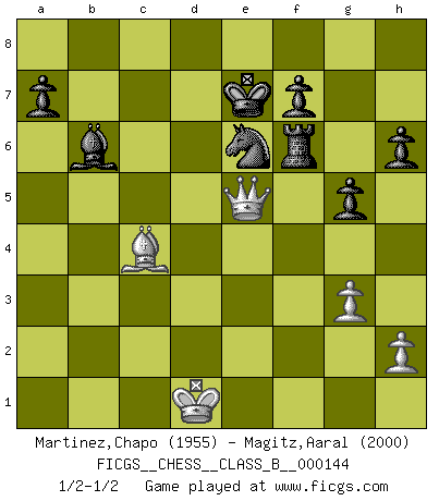 Last move : 1/2-1/2 2011 June 18 11:21:21 [Event "FICGS__CHESS__CLASS_B__000144"] [Site "FICGS"] [Date "2011.04.13"] [Round "1"] [White "Martinez,Chapo"] [Black "Magitz,Aaral"] [Result "1/2-1/2"] [WhiteElo "1955"] [BlackElo "2000"] 1.d4 Nf6 2.c4 e6 3.Nc3 d5 4.cxd5 exd5 5.Bg5 Be7 6.e3 O-O 7.Bd3 h6 8.Bh4 c5 9.dxc5 Nbd7 10.Nge2 Nxc5 11.O-O Be6 12.Bc2 Rc8 13.Nf4 Rc6 14.f3 g5 15.Nxe6 Nxe6 16.Bf2 Bc5 17.Qe2 d4 18.Rad1 dxe3 19.Rxd8 exf2+ 20.Kh1 Rxd8 21.g3 Bb6 22.Be4 Rcd6 23.Bxb7 Rd2 24.Qe5 Bd4 25.Qf5 Rxb2 26.Ne4 Nxe4 27.Bxe4 Rxa2 28.Bd3 Rc8 29.Qh7+ Kf8 30.Kg2 Ke7 31.Bg6 Rf8 32.Rb1 Re2 33.Bd3 f1Q+ 34.Kxf1 Rf2+ 35.Ke1 Rc8 36.Bf5 Rc6 37.Bg6 Rxf3 38.Rb7+ Rc7 39.Rxc7+ Nxc7 40.Bd3 Ne6 41.Kd1 Rf6 42.Qe4 Bb6 43.Bc4 Bf2 44.Qe5 Bd4 45.Qb8 Bb6 46.Qe5 1/2-1/2 Queen's pawn game Kingside Castling by player Black (move 6) Kingside Castling by player White (move 11) Promotion Queen by player Black (move 33) This chess game ended in a draw. Follow this game move after move (download)The blunders are all there on the board, waiting to be made. (Savielly Tartakover) Schach ist die gewalttätigste aller Sportarten. (Garry Kasparov) Si el Ajedrez es una ciencia, es la mas inexacta. Si el Ajedrez es un arte, es demasiado inexacto para ser visto como tal. Si el Ajedrez es un deporte, es demasiado esotérico. Si el Ajedrez es un juego, es demasiado exigente para ser solo un juego. Si el Ajedrez es una aventura, es una muy demandante. Si el Ajedrez es una pasión, es una muy gratificante. Si el Ajedrez es la vida, es una muy triste. (Anónimo) Les Echecs représentent une sphère d'idées créatrices basée sur la volonté des deux protagonistes. (Smyslov) No enterprise is more likely to succeed than one concealed from the enemy until it is ripe for execution. (Niccolo Machiavelli)