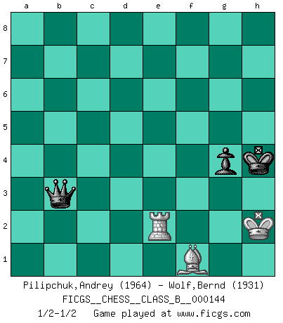 Last move : 1/2-1/2 2011 December 22 16:8:40 [Event "FICGS__CHESS__CLASS_B__000144"] [Site "FICGS"] [Date "2011.04.13"] [Round "1"] [White "Pilipchuk,Andrey"] [Black "Wolf,Bernd"] [Result "1/2-1/2"] [WhiteElo "1964"] [BlackElo "1931"] 1.e4 c5 2.Nf3 d6 3.d4 cxd4 4.Nxd4 Nf6 5.Nc3 a6 6.Be2 e5 7.Nb3 Be7 8.Be3 Be6 9.Nd5 Nbd7 10.Qd3 O-O 11.O-O Bxd5 12.exd5 Ne8 13.f3 Bg5 14.Bf2 f5 15.c4 Rc8 16.Rad1 b6 17.Nd2 Qe7 18.Rfe1 Kh8 19.Bf1 Qf7 20.b4 Qh5 21.Be2 Qg6 22.c5 dxc5 23.Qxa6 Nd6 24.Qa4 Qh6 25.Ba6 Rcd8 26.Nc4 Nxc4 27.Bxc4 e4 28.fxe4 Ne5 29.Qc2 Ng4 30.h3 Nxf2 31.Qxf2 fxe4 32.Qe2 e3 33.bxc5 Rf2 34.Qg4 Rf4 35.Qe2 Qh4 36.Qxe3 Rdf8 37.g3 Rg4 38.hxg4 Bxe3+ 39.Rxe3 Qxg4 40.Be2 Qg5 41.R1d3 bxc5 42.Re4 Qc1+ 43.Kg2 c4 44.Rf3 Rg8 45.Rxc4 Qd2 46.Rf2 Qxd5+ 47.Kh2 g6 48.Bf1 h5 49.Rfc2 Re8 50.Bg2 Qa5 51.Rc5 Qb4 52.R5c4 Qe1 53.R4c3 Kg7 54.Rf3 Rd8 55.Rcf2 Qe5 56.Rf4 Rd3 57.R4f3 Rd4 58.Bh3 Kh6 59.Kg1 g5 60.Bf1 g4 61.Re2 Re4 62.Rxe4 Qxe4 63.Rf4 Qe5 64.Kg2 Qd5+ 65.Kh2 Qxa2+ 66.Bg2 Qb2 67.Ra4 Qc3 68.Re4 Kg5 69.Re2 h4 70.gxh4+ Kxh4 71.Bf1 Qb3 1/2-1/2 Sicilian : Najdorf, Opovcensky variation Kingside Castling by player Black (move 10) Kingside Castling by player White (move 11) 10 pieces endgame at move 62 : White KRRBPP , Black KQPP WHITE : King + 2 Rooks 1 Bishop 2 Pawns BLACK : King + 1 Queen 2 Pawns 9 pieces endgame at move 62 : White KRBPP , Black KQPP WHITE : King + 1 Rook 1 Bishop 2 Pawns BLACK : King + 1 Queen 2 Pawns 8 pieces endgame at move 65 : White KRBP , Black KQPP WHITE : King + 1 Rook 1 Bishop 1 Pawn BLACK : King + 1 Queen 2 Pawns 7 pieces endgame at move 70 : White KRBP , Black KQP WHITE : King + 1 Rook 1 Bishop 1 Pawn BLACK : King + 1 Queen 1 Pawn 6 pieces endgame at move 70 : White KRB , Black KQP WHITE : King + 1 Rook 1 Bishop BLACK : King + 1 Queen 1 Pawn This chess game ended in a draw. Follow this game move after move (download)I play correspondence chess because it is both art and science while chess is art only. (A player at FICGS) Die Jungen erwarten, dass Opa einfach umfällt. Dann aber kann Opa fünf Stunden lang Schach spielen und die jungen Gegner an die Wand drücken. (Viktor Kortschnoi) Yo adoro todas la posiciones. Denme una partida posicional difícil, y la jugaré. Pero posiciones totalmente ganadas, no las tolero. (Hein Donner) Il vaut toujours mieux jouer un plan faux de façon logique que de n'avoir pas de plan du tout. (Victor Kortchnoï) If I had no sense of humor, I would long ago have committed suicide. (Mahatma Gandhi)