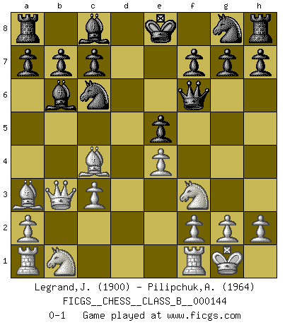 Last move : 0-1 2011 July 29 20:48:3 [Event "FICGS__CHESS__CLASS_B__000144"] [Site "FICGS"] [Date "2011.04.13"] [Round "1"] [White "Legrand,Jonathan"] [Black "Pilipchuk,Andrey"] [Result "0-1"] [WhiteElo "1900"] [BlackElo "1964"] 1.e4 e5 2.Nf3 Nc6 3.Bc4 Bc5 4.b4 Bxb4 5.c3 Ba5 6.d4 d6 7.O-O Bb6 8.dxe5 dxe5 9.Qb3 Qe7 10.Ba3 Qf6 0-1 This chess game has been lost on time (started : 2011.04.13 10:36:59) Evans gambit Kingside Castling by player White (move 7) Player Black won this chess game. Follow this game move after move (download)Fischer is the strongest player in the world. In fact, the strongest player who ever lived. (Larry Evans) Gegen einen Schachcomputer zu verlieren ist wie Löcher in den Strümpfen zuhaben. Es ist nicht peinlich, solange man der einzige ist der es weiß. (Anonymous) Debemos de asegurarnos de que el Ajedrez no se convierta en un lenguaje muerto, muy interesante, pero tan solo para un grupo muy pequeño. (Sytze Faber) 'L'échange des dames est un coup dur pour les deux adversaires...' Un journaliste lors d'une partie du match Spassky-Fischer Just because you do not take an interest in politics doesn't mean politics won't take an interest in you. (Pericles 430 B.C.)