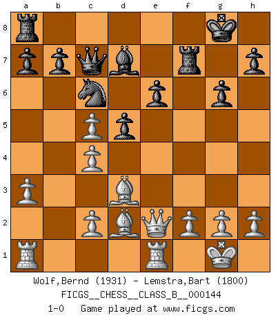 Last move : 1-0 2011 July 19 8:34:50 [Event "FICGS__CHESS__CLASS_B__000144"] [Site "FICGS"] [Date "2011.04.13"] [Round "1"] [White "Wolf,Bernd"] [Black "Lemstra,Bart"] [Result "1-0"] [WhiteElo "1931"] [BlackElo "1800"] 1.e4 e6 2.d4 d5 3.Nc3 Bb4 4.e5 c5 5.a3 Bxc3+ 6.bxc3 Ne7 7.Qg4 O-O 8.Bd3 f5 9.exf6 Rxf6 10.Bg5 Rf7 11.Qh5 g6 12.Qd1 Qa5 13.Bd2 Nbc6 14.Nf3 Qc7 15.dxc5 Ne5 16.Nxe5 Qxe5+ 17.Qe2 Qc7 18.c4 Nc6 19.O-O Bd7 20.Rfe1 1-0 This chess game has been lost on time (started : 2011.04.13 10:36:59) French : Winawer, Advance, poisoned pawn variation Kingside Castling by player Black (move 7) Kingside Castling by player White (move 19) Player White won this chess game. Follow this game move after move (download)The laws of Chess do not permit a free choice: you have to move whether you like it or not. (Emanuel Lasker) Jede Eröffnung ist gut genug um gespielt zu werden, wenn nur ihr Ruf schlecht genug ist. (Savielly Grigorievitsch Tartakower) La vida es como un juego de Ajedrez, cambiando con cada movimiento. (Proverbio Chino) Les Echecs ne sont pas pour les âmes timides. Ils requièrent un homme entier, qui ne s'arrête pas aveuglément à ce qui a été déjà établi, mais qui tente individuellement de sonder les profondeurs du jeu. (W. Steinitz) If you are good, you will be assigned all the work. If you are really good, you will get out of it. (Dan Rotaru)