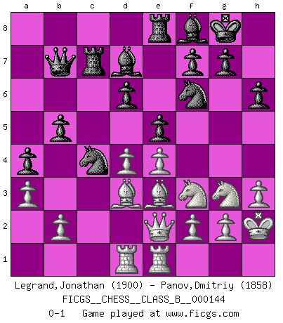 Last move : 0-1 2011 August 25 22:1:58 [Event "FICGS__CHESS__CLASS_B__000144"] [Site "FICGS"] [Date "2011.04.13"] [Round "1"] [White "Legrand,Jonathan"] [Black "Panov,Dmitriy"] [Result "0-1"] [WhiteElo "1900"] [BlackElo "1858"] 1.e4 e5 2.Nf3 Nc6 3.Bb5 a6 4.Ba4 Nf6 5.O-O Be7 6.Re1 b5 7.Bb3 d6 8.c3 O-O 9.h3 Na5 10.Bc2 c5 11.d4 Qc7 12.Nbd2 cxd4 13.cxd4 Nc6 14.Nb3 a5 15.Be3 a4 16.Nbd2 Bd7 17.Rc1 Qb7 18.a3 Rfc8 19.Bb1 Rc7 20.Qe2 Rac8 21.Rcd1 h6 22.Nf1 Bf8 23.Ng3 Re8 24.Bd3 Na5 25.Kh2 Nc4 0-1 This chess game has been lost on time (started : 2011.04.13 10:36:59) Ruy Lopez : Closed Kingside Castling by player White (move 5) Kingside Castling by player Black (move 8) Player Black won this chess game. Follow this game move after move (download)Morphy was probably the greatest genius of them all. (Bobby Fischer) Gewöhnliche Menschen denken nur daran, wie sie ihre Zeit verbringen. Ein intelligenter Mensch versucht, sie auszunutzen. (Arthur Schopenhauer) Tu sabes, camarada Pachman, no disfruto el ser un Ministro, preferería jugar al Ajedrez como tu. (Che Guevara) La vie est comme un jeu d'échecs : nous esquissons un plan, mais celui-ci est tributaire de ce que daignent faire l'adversaire aux échecs et le destin dans la vie. (Arthur Schopenhauer) I don't know, I don't care, and it doesn't make any difference. (Albert Einstein)