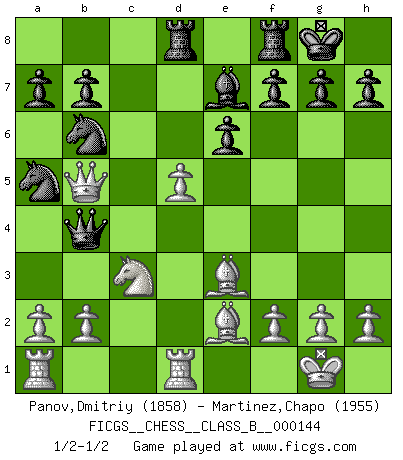 Last move : 1/2-1/2 2011 May 4 18:23:18 [Event "FICGS__CHESS__CLASS_B__000144"] [Site "FICGS"] [Date "2011.04.13"] [Round "1"] [White "Panov,Dmitriy"] [Black "Martinez,Chapo"] [Result "1/2-1/2"] [WhiteElo "1858"] [BlackElo "1955"] 1.e4 c5 2.c3 Nf6 3.e5 Nd5 4.d4 cxd4 5.cxd4 d6 6.Nf3 Nc6 7.Bc4 Nb6 8.Bb5 dxe5 9.Nxe5 Bd7 10.Nxd7 Qxd7 11.O-O e6 12.Nc3 Rd8 13.Be3 Be7 14.Qb3 O-O 15.Rfd1 Qd6 16.Be2 Na5 17.Qb5 Qb4 18.d5 1/2-1/2 Sicilian : Alapin's variation (2.c3) Kingside Castling by player White (move 11) Kingside Castling by player Black (move 14) This chess game ended in a draw. Follow this game move after move (download)It is not a move, even the best move that you must seek, but a realizable plan. (Eugene Znosko-Borovsky) Kasparov ist eine Art Monster mit hundert Augen, denen auch nicht das Geringste entgeht. (Tony Miles) Una de estas pequeñas movidas modestas pudieran ser mas molestas a tu oponente que la amenaza mas grande. (Siegbert Tarrasch) Aucun coup ne doit être joué sans but. (Pedro Damiano) There are three kinds of lies: lies, damned lies and statistics. (Mark Twain)