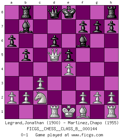 Last move : 0-1 2011 July 8 17:39:59 [Event "FICGS__CHESS__CLASS_B__000144"] [Site "FICGS"] [Date "2011.04.13"] [Round "1"] [White "Legrand,Jonathan"] [Black "Martinez,Chapo"] [Result "0-1"] [WhiteElo "1900"] [BlackElo "1955"] 1.e4 c5 2.Nf3 Nc6 3.d4 cxd4 4.Nxd4 Nf6 5.Nc3 e5 6.Ndb5 d6 7.Bg5 a6 8.Na3 b5 9.Nd5 Be7 10.Bxf6 Bxf6 11.c3 Ne7 12.Nc2 Nxd5 13.Qxd5 Rb8 14.Rd1 Bb7 0-1 This chess game has been lost on time (started : 2011.04.13 10:36:59) Sicilian : Pelikan (Lasker/Sveshnikov) variation Player Black won this chess game. Follow this game move after move (download)It began to feel as though you were playing against Chess itself. - On playing against Robert Fischer. (Walter Shipman) Schach ist ein Teil der Kultur, und wenn es mit der Kultur abwärts geht, geht es auch mit dem Schach abwärts. (Mikhail Moiseyevich Botvinik) El Ajedrez es un expediente tonto que hace creer a la gente inactiva que hacen una cosa muy astuta cuando solamente estan perdiendo su tiempo. (George Bernard Shaw) Que feriez-vous si vous étiez en train de jouer aux échecs et que la fin du monde arrive ? Je continuerais à jouer. (Saint Borromée) I would love to change the world, but they won't give me the source code. (Unknown)