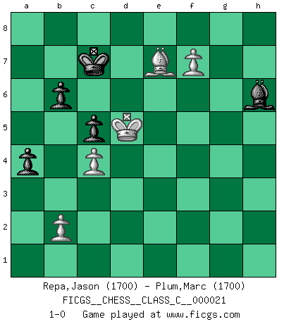 Last move : 1-0 2007 March 6 23:28:17 [Event "FICGS__CHESS__CLASS_C__000021"] [Site "FICGS"] [Date "2006.12.17"] [Round "1"] [White "Repa,Jason"] [Black "Plum,Marc"] [Result "1-0"] [WhiteElo "1700"] [BlackElo "1700"] 1.e4 e5 2.Nf3 Nc6 3.Bb5 a6 4.Bxc6 dxc6 5.O-O f6 6.d4 exd4 7.Nxd4 c5 8.Ne2 Qxd1 9.Rxd1 Bd7 10.Nbc3 O-O-O 11.Be3 b6 12.a4 a5 13.Nb5 Bxb5 14.Rxd8+ Kxd8 15.axb5 Bd6 16.Rd1 Ne7 17.f4 Kc8 18.Kf2 Rd8 19.Nc3 c6 20.bxc6 Kc7 21.Nd5+ Kxc6 22.c4 Kb7 23.Kf3 Nxd5 24.Rxd5 Kc6 25.e5 Be7 26.Rxd8 Bxd8 27.Ke4 g6 28.g4 Be7 29.f5 gxf5+ 30.gxf5 fxe5 31.Kxe5 Bd6+ 32.Ke6 Bxh2 33.f6 h5 34.f7 Bd6 35.Bh6 h4 36.Bg5 Bf8 37.Bxh4 a4 38.Bf6 Bh6 39.Be7 Kc7 40.Kd5 1-0 Ruy Lopez : Exchange, Gligoric variation Kingside Castling by player White (move 5) Queenside Castling by player Black (move 10) 10 pieces endgame at move 37 : White KBPPP , Black KBPPP WHITE : King + 1 Bishop 3 Pawns BLACK : King + 1 Bishop 3 Pawns Player White won this chess game. Follow this game move after move (download)It is the aim of the modern school, not to treat every position according to one general law, but according to the principle inherent in the position. (Richard Reti) Im Leben werden Partien nie so unstrittig gewonnen wie im Spiel (Emanuel Lasker) Por la belleza de sus partidas, la claridad de su juego y lo brillante de sus ideas, Fischer se creó el mismo como un artista de la misma estatura como Brahms, Rembrandt y Shakespeare. (David Levy) L'ordinateur a tué l'originalité. Il n'y a plus guère d'aventures sur l'échiquier. (Jacob Murray) The general who wins the battle makes many calculations in his temple before the battle is fought. The general who loses makes but few calculations beforehand. (Sun Tzu)