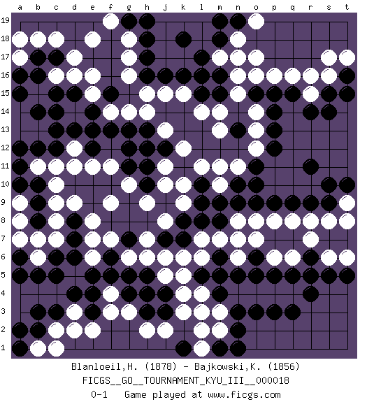 Last move : 0-1 2011 September 26 19:23:11 [Event "FICGS__GO__TOURNAMENT_KYU_III__000018"] [Site "FICGS"] [Date "2011.04.13"] [Round "1"] [Black "Blanloeil,Hugues"] [White "Bajkowski,Karol"] [Result "0-1"] [Rating 1 "1878"] [Rating 2 "1856"] 1.q3 d17 2.d4 q16 3.r5 k3 4.n3 g3 5.c6 d2 6.c3 c2 7.d15 c8 8.c13 e8 9.r11 c11 10.c17 c18 11.b17 d16 12.c15 g16 13.l17 n17 14.h17 g17 15.j16 e6 16.b2 b1 17.a2 b7 18.b5 d5 19.e4 f3 20.f5 h6 21.f6 f7 22.d7 e7 23.d8 d9 24.h5 j6 25.g7 g6 26.d6 f9 27.e5 e15 28.e14 f14 29.r14 q8 30.f15 e16 31.f13 g14 32.e12 s16 33.r9 r8 34.q9 p8 35.p9 p6 36.m5 m7 37.p14 n15 38.n13 m11 39.o11 m13 40.n9 n6 41.l9 n4 42.m4 m3 43.n5 o4 44.o3 p4 45.p3 l4 46.m18 n18 47.b12 j15 48.h18 k15 49.k16 g18 50.k18 d14 51.e13 c16 52.b16 b15 53.c14 b18 54.b14 a17 55.a15 h12 56.g11 j10 57.b10 c10 58.b9 c9 59.b8 c7 60.s15 r15 61.s14 b11 62.a11 s6 63.s5 o13 64.p15 p16 65.t16 t17 66.t15 s17 67.p13 q4 68.r4 m2 69.n2 o12 70.p12 n11 71.o10 d12 72.d13 b6 73.c5 g10 74.k8 j8 75.k7 k6 76.g5 o14 77.n19 o19 78.m19 o17 79.g13 h14 80.h13 j13 81.h11 j11 82.h10 h9 83.m1 l1 84.n1 d3 85.b3 l3 86.l10 l11 87.s9 s8 88.l15 l14 89.j7 h7 90.k1 l2 91.h3 h4 92.j4 h2 93.m6 l7 94.o6 n7 95.p5 o7 96.o5 l6 97.j3 j2 98.g4 t9 99.t10 t8 100.s10 q6 101.q5 f11 102.g12 e11 103.g19 f19 104.h19 e18 105.m15 m14 106.j12 k12 107.q15 t6 108.t5 r16 109.c12 k9 110.l8 k10 111.e3 e2 112.a1 c1 113.a5 j5 114.m16 m17 115.r6 r7 116.l5 k5 117.o15 n16 118.l16 d11 119.h16 h15 120.a10 a8 121.h12 o16 122.a16 a18 123.h4 k4 124.n10 o8 125.m8 m10 126.a6 a7 127.a12 a9 128.o9 f4 129.m9 n8 0-1 Here are the names of the openings (joseki) played in the four corners : Corner d4 : d4 g3 Hoshi (Hwajeom, Seongjeom, Xingwei`) 4-4 Point. The star or hoshi (4-4) point, emphasizing influence at the potential expense of territory. Niken Kakari (Dukan Keolch'im, E`r Gua`jiao~, 2-Space Low Approach). Black typically answers by 7-3 or 3-5 (which is not joseki). Corner d16 : d17 d15 Komoku (Somok, Xiao~mu`) 3-4 Point. The komoku (3-4) point is the traditional corner enclosure move.. Ikken Takagakari (Hankan Nop'dakeolch'im, Yi Gaogua`jiao~, 1-Space High Approach). The 5-4 approach move has become more popular in modern times, as modern Go emphasizes speed and influence. Corner q16 : q16 r11 Hoshi (Hwajeom, Seongjeom, Xingwei`) 4-4 Point. The star or hoshi (4-4) point, emphasizing influence at the potential expense of territory. Player White won this Go (weiqi, baduk) game. Follow this game move after move (download)Go is essentially a form of harmony. Go in the 21st century will have to be go of the 'harmony of the six points - the four quarters, the above and the below.' As in life we will need to view the whole rather than the part. Japanese go has focused too heavily on the local (joseki) rather than the whole for 300 years. The reason the Chinese and Koreans are overtaking the Japanese is that they are closer to achieve this whole-board view. (Go Seigen, 9p, 1994) He who defends everything defends nothing. (Frederick the Great)