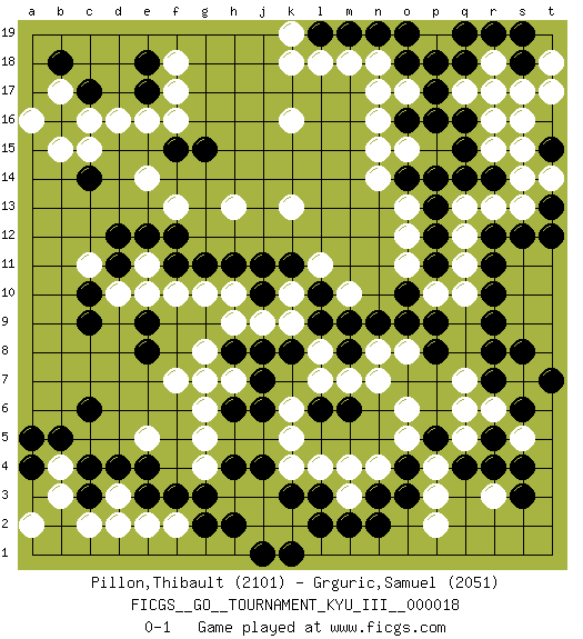 Last move : 0-1 2011 December 3 3:18:51 [Event "FICGS__GO__TOURNAMENT_KYU_III__000018"] [Site "FICGS"] [Date "2011.04.13"] [Round "1"] [Black "Pillon,Thibault"] [White "Grguric,Samuel"] [Result "0-1"] [Rating 1 "2101"] [Rating 2 "2051"] 1.q16 d16 2.r4 p3 3.d4 q5 4.r5 q6 5.r7 r6 6.s6 s7 7.s8 q7 8.r8 s5 9.t7 r3 10.s4 k4 11.c6 k16 12.c14 o17 13.o16 n16 14.p17 o15 15.p16 n17 16.q14 f17 17.d12 d3 18.e3 e2 19.c3 d2 20.f3 f2 21.g3 b3 22.c4 c2 23.h6 d10 24.f11 e11 25.e12 f10 26.g11 g10 27.h11 h10 28.j10 h7 29.j6 j9 30.k11 k10 31.j11 k9 32.f15 f16 33.j7 f7 34.l6 m4 35.h8 g7 36.j8 h9 37.m8 e5 38.e4 g5 39.j4 j3 40.h4 m10 41.o9 l11 42.c9 h3 43.c10 g4 44.p8 r18 45.q18 s16 46.r17 r13 47.r14 s14 48.s12 s13 49.p12 r15 50.q15 s17 51.s18 p10 52.r12 r16 53.t15 q17 54.r19 r17 55.o18 q13 56.p13 q12 57.r10 q11 58.o10 q10 59.r9 o11 60.p11 o13 61.p14 t18 62.s19 o12 63.m19 m18 64.l19 k18 65.o14 n14 66.r11 p19 67.p18 s15 68.q19 n18 69.o19 t17 70.n19 k19 71.t13 t14 72.t12 n15 73.q4 p4 74.p5 o6 75.g2 n8 76.c17 n7 77.g15 c16 78.b16 b15 79.b18 c15 80.e18 f18 81.e17 e16 82.k3 k2 83.l3 j2 84.l2 l4 85.n3 n4 86.o3 m3 87.m2 a16 88.m9 b17 89.o4 o5 90.s3 p2 91.n2 b4 92.b5 m7 93.n9 l7 94.k8 l8 95.l9 k6 96.l10 k5 97.h2 g8 98.j1 e14 99.e9 e10 100.e8 f13 101.f12 h13 102.a4 a2 103.a5 g6 104.k1 c11 105.d11 k13 106.m6 o8 107.p9 l18 0-1 This go game has been lost on time (started : 2011.04.13 15:43:45) Here are the names of the openings (joseki) played in the four corners : Corner q4 : r4 p3 Komoku (Somok, Xiao~mu`) 3-4 Point. The komoku (3-4) point is the traditional corner enclosure move.. Ikken Kakari (Hankan Keolch'im, Yi Gua`jiao~, 1-Space Low Pincer). The small knight move is the basic approach move to the 3-4 point stone. It has been continually used for over four centuries. There are limitless variations, with new moves constantly being discovered. White 2 opens the door to a treaure store of joseki. Corner d16 : d16 c14 Hoshi (Hwajeom, Seongjeom, Xingwei`) 4-4 Point. The star or hoshi (4-4) point, emphasizing influence at the potential expense of territory. Ikken Kakari (Hankan Keolch'im, Yi Gua`jiao~, 1-Space Low Approach). Black 2 is the standard approach move to the 4-4. Corner q16 : q16 o17 Hoshi (Hwajeom, Seongjeom, Xingwei`) 4-4 Point. The star or hoshi (4-4) point, emphasizing influence at the potential expense of territory. Ikken Kakari (Hankan Keolch'im, Yi Gua`jiao~, 1-Space Low Approach). White 2 is the standard approach move to the 4-4. Player White won this Go (weiqi, baduk) game. Follow this game move after move (download)With only one group, you will win. (Anonymous) I teach you to lie, cheat and steal, and as soon as my back's turned you wait in line ? (Gregory House, House M.D.)