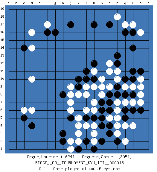 Last move : 0-1 2011 September 17 1:22:59 [Event "FICGS__GO__TOURNAMENT_KYU_III__000018"] [Site "FICGS"] [Date "2011.04.13"] [Round "1"] [Black "Segur,Laurine"] [White "Grguric,Samuel"] [Result "0-1"] [Rating 1 "1624"] [Rating 2 "2051"] 1.d4 d16 2.q16 p3 3.q10 c6 4.h3 d10 5.r6 r4 6.m17 q9 7.r10 r17 8.r16 q17 9.o17 p18 10.j17 k3 11.c5 d6 12.p13 s16 13.r14 r9 14.f16 p10 15.p9 s10 16.o10 p11 17.r11 o12 18.p12 o11 19.p8 s8 20.s11 q7 21.m12 m11 22.l11 n10 23.n9 o9 24.o8 m9 25.l10 n8 26.o7 r7 27.q6 p6 28.o6 p5 29.q5 q4 30.s6 p7 31.q8 s9 32.r8 s7 33.n5 m4 34.m5 l4 35.l5 k5 36.l7 l9 37.m10 k8 38.k7 j7 39.n7 m6 40.m8 n9 41.k9 j9 42.k10 l8 43.h8 j8 44.k6 j6 45.j5 k4 46.n4 m7 47.n2 o5 48.n6 l6 49.l2 k2 50.p2 q2 51.o4 p4 52.o3 m3 53.k1 m2 54.m1 j2 55.h2 j1 56.c14 f17 57.g16 d14 0-1 Here are the names of the openings (joseki) played in the four corners : Corner d4 : d4 c6 Hoshi (Hwajeom, Seongjeom, Xingwei`) 4-4 Point. The star or hoshi (4-4) point, emphasizing influence at the potential expense of territory. Ikken Kakari (Hankan Keolch'im, Yi Gua`jiao~, 1-Space Low Approach). White 2 is the standard approach move to the 4-4. Corner q4 : p3 r6 Mokuhazushi (Waemok, Wai`mu`) 5-3 Point. The mokuhazushi (5-3) point was popular in the Edo period in Japan (1600 - 1867). It emphasizes influence; territorially, it is inferior to the 3-4 point. Corner d16 : d16 j17 Hoshi (Hwajeom, Seongjeom, Xingwei`) 4-4 Point. The star or hoshi (4-4) point, emphasizing influence at the potential expense of territory. Player White won this Go (weiqi, baduk) game. Follow this game move after move (download)One point in the center is worth ten in the corner. (Anonymous) The worth of a book is to be measured by what you can carry away from it. (James Bryce)
