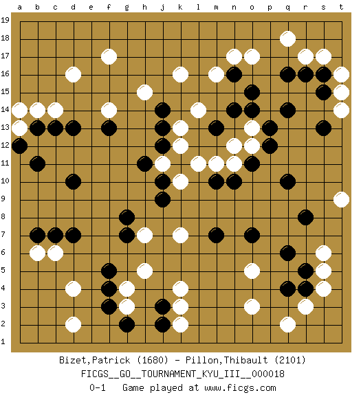 Last move : 0-1 2011 August 5 23:15:29 [Event "FICGS__GO__TOURNAMENT_KYU_III__000018 "] [Site "FICGS"] [Date "2011.04.13"] [Round "1"] [Black "Bizet,Patrick "] [White "Pillon,Thibault "] [Result "0-1"] [Rating 1 "1680"] [Rating 2 "2101"] 1.q4 d16 2.q16 d4 3.q10 k10 4.d10 k16 5.d13 o3 6.q6 k4 7.d7 o17 8.q14 c14 9.c13 c6 10.f3 d2 11.f5 o5 12.o7 q2 13.o15 q18 14.m10 r3 15.m7 f17 16.m13 s6 17.r5 s5 18.r4 s4 19.r8 r17 20.r16 s17 21.c7 t14 22.s16 t16 23.s15 t15 24.s13 m16 25.n16 n17 26.j3 k3 27.j2 k2 28.j14 l14 29.j12 k13 30.j13 k12 31.k11 k7 32.j10 l11 33.j9 j11 34.h11 f14 35.f13 b14 36.b13 m11 37.n10 n11 38.o11 b6 39.b7 a13 40.a12 a14 41.b11 h7 42.g8 h5 43.g7 g4 44.f4 g3 45.g2 o12 46.p12 o13 47.p13 h15 48.n14 n12 49.o14 t9 0-1 Here are the names of the openings (joseki) played in the four corners : Corner d16 : d16 d13Hoshi (Hwajeom, Seongjeom, Xingwei`) 4-4 Point. The star or hoshi (4-4) point, emphasizing influence at the potential expense of territory.Niken Takagakari (Dukan Nop'dakeolch'im, E`r Gaojia, 2-Space High Approach). Black 2 is a light approach move. Rarely played in even games, Black 2 is typically employed in handicap games. White continues with 6-4 or 3-10. In Korean Sunjang Baduk White has a stone on 8-4. Corner q4 : q4 o3Hoshi (Hwajeom, Seongjeom, Xingwei`) 4-4 Point. The star or hoshi (4-4) point, emphasizing influence at the potential expense of territory.Ikken Kakari (Hankan Keolch'im, Yi Gua`jiao~, 1-Space Low Approach). White 2 is the standard approach move to the 4-4. Corner d4 : d4 d7Hoshi (Hwajeom, Seongjeom, Xingwei`) 4-4 Point. The star or hoshi (4-4) point, emphasizing influence at the potential expense of territory.Niken Takagakari (Dukan Nop'dakeolch'im, E`r Gaojia, 2-Space High Approach). Black 2 is a light approach move. Rarely played in even games, Black 2 is typically employed in handicap games. White continues with 6-4 or 3-10. In Korean Sunjang Baduk White has a stone on 8-4. Corner q16 : q16 o17Hoshi (Hwajeom, Seongjeom, Xingwei`) 4-4 Point. The star or hoshi (4-4) point, emphasizing influence at the potential expense of territory.Ikken Kakari (Hankan Keolch'im, Yi Gua`jiao~, 1-Space Low Approach). White 2 is the standard approach move to the 4-4. Player White won this Go (weiqi, baduk) game.Follow this game move after move (download ) If there is no stone on the handicap point, the carpenter's square is dead. (Anonymous) We need strong personalities and only one world champion to attract sponsors. (Anatoly Karpov)