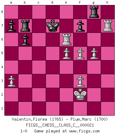 Last move : 1-0 2007 March 28 20:23:33 [Event "FICGS__CHESS__CLASS_C__000021"] [Site "FICGS"] [Date "2006.12.17"] [Round "1"] [White "Valentin,Florea"] [Black "Plum,Marc"] [Result "1-0"] [WhiteElo "1765"] [BlackElo "1700"] 1.e4 e6 2.d4 d5 3.Nc3 Bb4 4.e5 c5 5.a3 Bxc3+ 6.bxc3 Qc7 7.Qg4 Ne7 8.Qxg7 Rg8 9.Qxh7 cxd4 10.Ne2 Nbc6 11.f4 Bd7 12.Qd3 dxc3 13.Qxc3 Nf5 14.Ng3 Nxg3 15.hxg3 Rc8 16.Ra2 d4 17.Qd3 Qa5+ 18.Bd2 Qb6 19.Kf2 Ne7 20.Qb3 Qxb3 21.cxb3 Nf5 22.Rh3 Ne3 23.Bxe3 dxe3+ 24.Kxe3 Rc3+ 25.Kf2 Rxb3 26.g4 Rb1 27.Be2 Bc6 28.Rc2 Ke7 29.Bf3 Bxf3 30.gxf3 Rd1 31.Rh7 Rd7 32.g5 b6 33.Rc6 Rb7 34.f5 Kd7 35.Rxe6 1-0 French : Winawer, Classical variation Player White won this chess game. Follow this game move after move (download)Best by test: 1. e4 (Bobby Fischer) Schach ist wie eine schöne Frau, zu der wir ständig zurückkehren, gleichviel, wie oft sie uns zurückweist. (Anonymous) Bobby solo arroja las piezas y solas caen en las casillas correctas. (Miguel Najdorf ) 'L'échange des dames est un coup dur pour les deux adversaires...' Un journaliste lors d'une partie du match Spassky-Fischer Just because you do not take an interest in politics doesn't mean politics won't take an interest in you. (Pericles 430 B.C.)