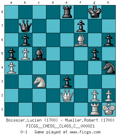 Last move : 0-1 2007 February 8 13:16:9 [Event "FICGS__CHESS__CLASS_C__000021"] [Site "FICGS"] [Date "2006.12.17"] [Round "1"] [White "Boissier,Lucien"] [Black "Mueller,Robert"] [Result "0-1"] [WhiteElo "1700"] [BlackElo "1700"] 1.d4 Nf6 2.Nf3 g6 3.Bg5 Bg7 4.Nbd2 O-O 5.e3 d5 6.c3 Nbd7 7.Be2 Re8 8.O-O e5 9.b4 c6 10.a4 a5 11.b5 c5 12.Ndb3 e4 13.Nfd2 c4 14.Nc1 b6 15.f3 h6 16.Bh4 exf3 17.Bxf3 Ra7 18.e4 g5 19.Bg3 dxe4 20.Be2 Nd5 21.Nxc4 Nf8 22.Qd2 Nxc3 23.Nd6 Ne6 24.Nxe8 Bxd4+ 25.Kh1 e3 26.Qc2 Qxe8 27.Ra3 Nxe2 28.Nxe2 Bc5 29.Rd3 Bb7 30.Rd3d1 Qa8 31.Rg1 Ng7 32.Be5 Be4 33.Qb2 Nf5 34.Nc3 Re7 35.Bf6 Re8 36.Qe2 Bb7 37.Rd7 Nh4 38.Rxb7 Qxb7 0-1 King's Indian : Torre attack Kingside Castling by player Black (move 4) Kingside Castling by player White (move 8) Player Black won this chess game. Follow this game move after move (download)There are tough players and nice guys, and I'm a tough player. (Bobby Fischer) Der beste Spieler in einem Turnier gewinnt es nie. Er landet auf Platz zwei oder drei. (Siegbert Tarrasch) Buenas posiciones no logran ganar juegos, buenas movidas sí. (Gerald Abrahams) Les échecs, c'est l'imagination. (David Bronstein) All politicians must be presumed guilty until they are proven innocent. (Dinesh De Silva)