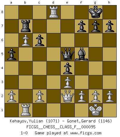 Last move : 1-0 2011 April 28 12:56:59 [Event "FICGS__CHESS__CLASS_F__000095"] [Site "FICGS"] [Date "2011.04.14"] [Round "1"] [White "Kehayov,Yulian"] [Black "Gonet,Gerard"] [Result "1-0"] [WhiteElo "1071"] [BlackElo "1146"] 1.Nc3 Nc6 2.d4 d5 3.Bf4 Bf5 4.e3 Nf6 5.Nf3 e6 6.Bd3 Ne4 7.Bxe4 dxe4 8.Nd2 Bb4 9.O-O Bxc3 10.bxc3 O-O 11.Rb1 Rb8 12.Qe2 Ne7 13.c4 Ng6 14.Bg3 b6 15.Rfd1 a5 16.Rb5 Re8 17.c5 c6 18.R5b1 e5 19.dxe5 Nxe5 20.Nc4 Qf6 21.Nxe5 Rxe5 22.cxb6 Rb7 23.Bxe5 Qxe5 24.Rd8+ 1-0 Dunst (Sleipner, Heinrichsen) Opening Kingside Castling by player White (move 9) Kingside Castling by player Black (move 10) Player White won this chess game. Follow this game move after move (download)Chess is a foolish expedient for making idle people believe they are doing something very clever when they are only wasting their time. (George Bernard Shaw) Wer wird heute Abend ihr Gegner sein? -- Heute Abend spiele ich gegen die schwarzen Steine. (Akiba Rubinstein) La caracteristica mas importante en la posición del Ajedrez es la actividad de las piezas. Esto es absolutamente fundamental en todas las fases del juego: Apertura, Juego Medio y especialmente Finales. La limitación primordial en la actividad de una pieza, es la estructuración de los Peones. (Michael Stean) Le pion, dans sa simplicité, marche droit devant lui, mais lorsqu'il prend, il le fait obliquement? Ainsi l'homme, tant qu'il reste pauvre, marche dans la droiture et vit honnêtement, mais lorsqu'il recherche les honneurs, il flatte, se parjure et, par les voies obliques, cherche une position supérieure sur l'échiquier du monde. (Jean de Galles) Creativity is allowing yourself to make mistakes. Art is knowing which ones to keep. (Scott Adams)