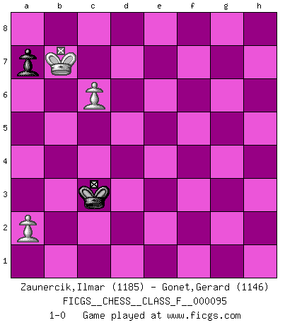 Last move : 1-0 2011 May 6 22:38:52 [Event "FICGS__CHESS__CLASS_F__000095"] [Site "FICGS"] [Date "2011.04.14"] [Round "1"] [White "Zaunercik,Ilmar"] [Black "Gonet,Gerard"] [Result "1-0"] [WhiteElo "1185"] [BlackElo "1146"] 1.e4 Nc6 2.Nf3 Nf6 3.Nc3 d5 4.e5 d4 5.exf6 dxc3 6.bxc3 gxf6 7.Bc4 e5 8.d3 Bg4 9.Bxf7+ Kxf7 10.Ng5+ fxg5 11.Qxg4 Be7 12.Qf5+ Bf6 13.Bxg5 Rg8 14.Qxh7+ Ke6 15.Be3 Rh8 16.Qe4 Rg8 17.d4 Kf7 18.O-O-O Qe7 19.dxe5 Nxe5 20.Qh7+ Rg7 21.Qh5+ Kg8 22.Bd4 Qa3+ 23.Kb1 Rh7 24.Qf5 Qd6 25.Rhe1 Re8 26.f4 Nc4 27.Rxe8+ Kf7 28.Qxf6+ Qxf6 29.Bxf6 Kxe8 30.Rd8+ Kf7 31.Rd7+ Kg6 32.Rxh7 Kxh7 33.g4 Kg6 34.g5 Kf5 35.Be5 Nxe5 36.fxe5 Kxg5 37.Kc1 Kf5 38.Kd2 Kxe5 39.Ke3 Kf5 40.c4 Kg4 41.Kd4 Kh3 42.Kd5 Kxh2 43.c5 Kg3 44.Ke6 Kf3 45.Kd7 c6 46.Kc7 Ke3 47.Kxb7 Kd2 48.Kxc6 Kxc2 49.Kb7 Kc3 50.c6 1-0 KP : Nimzovich defense Queenside Castling by player White (move 18) 10 pieces endgame at move 36 : White KPPPPP , Black KPPP WHITE : King + 5 Pawns BLACK : King + 3 Pawns 9 pieces endgame at move 38 : White KPPPP , Black KPPP WHITE : King + 4 Pawns BLACK : King + 3 Pawns 8 pieces endgame at move 42 : White KPPP , Black KPPP WHITE : King + 3 Pawns BLACK : King + 3 Pawns 7 pieces endgame at move 47 : White KPPP , Black KPP WHITE : King + 3 Pawns BLACK : King + 2 Pawns 6 pieces endgame at move 48 : White KPPP , Black KP WHITE : King + 3 Pawns BLACK : King + 1 Pawn 5 pieces endgame at move 48 : White KPP , Black KP WHITE : King + 2 Pawns BLACK : King + 1 Pawn Player White won this chess game. Follow this game move after move (download)Discovered check is the dive bomber of the Chessboard. (Reuben Fine) Das Schach ist nichts für kleine Geister, es beansprucht einen vollen Mann, der sich nicht sklavisch an das Überlieferte hält, sondern selbständig die Tiefen des Spiels zu ergründen sucht. (Wilhelm Steinitz) Aquel que toma al Peón de Caballo de la Reina, se pasará la noche a dormir en la calle. (Anónimo) Les Cavaliers se révèlent fort utiles dans les positions fermées. D'habitude, les Fous sont un peu plus forts que les Cavaliers dans les positions ouvertes. Qu'on le veuille ou non, il restera toujours des exceptions ! I feel so... helpless. (C-3PO in Star Wars ep.3)