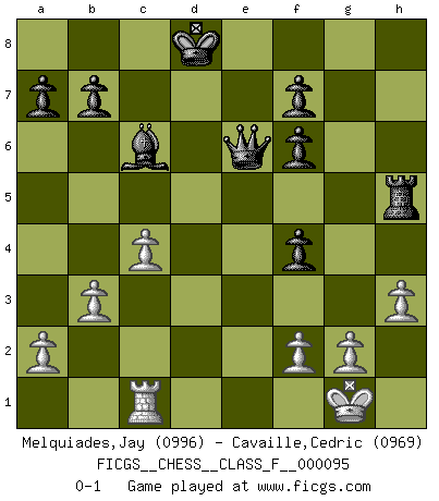 Last move : 0-1 2011 May 4 17:59:50 [Event "FICGS__CHESS__CLASS_F__000095"] [Site "FICGS"] [Date "2011.04.14"] [Round "1"] [White "Melquiades,Jay"] [Black "Cavaille,Cedric"] [Result "0-1"] [WhiteElo "0996"] [BlackElo "0969"] 1.e4 c5 2.Nf3 d6 3.h3 Nf6 4.Nc3 e6 5.d4 cxd4 6.Nxd4 e5 7.Bb5+ Nc6 8.Bg5 Bd7 9.Nxc6 Bxc6 10.Nd5 Bxb5 11.Nxf6+ gxf6 12.Bh4 Bh6 13.Bg3 Qc7 14.Qd5 Bc6 15.Qb3 Qb6 16.Qf3 Bg7 17.O-O O-O-O 18.b3 d5 19.exd5 Bxd5 20.Qc3+ Qc6 21.Qd2 h5 22.Rfd1 Bh6 23.Qd3 Qa6 24.Qf5+ Qe6 25.Qxh5 Bf4 26.Bxf4 Rxh5 27.Rac1 exf4 28.c4 Bc6 29.Rxd8+ Kxd8 0-1 Sicilian Kingside Castling by player White (move 17) Queenside Castling by player Black (move 17) Player Black won this chess game. Follow this game move after move (download)After black's reply to 1.e4 with 1..e5, leaves him always trying to get into the game. (Howard Staunton) Vom Schach wurde gesagt das Leben sei dafür nicht lange genug. Aber das ist der Fehler des Lebens, nicht des Schach'. (Irving Chernev) Alekhine es un poeta que crea un trabajo de arte de algo que raramente inspiraría a otra persona a mandar una tarjeta postal. (Max Euwe) Nous sommes les pions de la mystérieuse partie d'Echecs jouée par Dieu. Il nous déplace, nous arrête, nous pousse encore, puis nous lance un à un dans la boîte du Néant. Epitaphe sur la tombe de David Janowsky (1868-1927). If you have any trouble condescending, find a Unix user to show you how it's done. (Scott Adams)