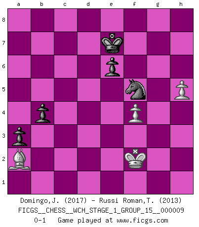 Last move : 0-1 2011 October 13 23:47:16 [Event "FICGS__CHESS__WCH_STAGE_1_GROUP_15__000009"] [Site "FICGS"] [Date "2011.04.15"] [Round "1"] [White "Domingo,Jordi"] [Black "Russi Roman,Tano-Urayoan"] [Result "0-1"] [WhiteElo "2017"] [BlackElo "2013"] 1.e4 c6 2.d4 d5 3.e5 Bf5 4.Nc3 e6 5.g4 Bg6 6.Nge2 c5 7.h4 h5 8.Nf4 Bh7 9.Nxh5 Nc6 10.dxc5 Bxc5 11.Nxg7+ Kf8 12.Nh5 d4 13.Nb1 Qd5 14.Rh3 Rc8 15.Bf4 Nxe5 16.Qe2 Bd6 17.Bxe5 Bxe5 18.f4 Bd6 19.c3 d3 20.Qf2 Bc5 21.Qg3 Bg6 22.Nd2 f5 23.Bxd3 fxg4 24.Bxg6 gxh3 25.O-O-O Rxh5 26.Nf1 Qg2 27.Bxh5 Ba3 28.bxa3 Qxg3 29.Nxg3 Rxc3+ 30.Kd2 Rxg3 31.Ke2 Rxa3 32.Bg4 Ke7 33.Rh1 h2 34.Kf1 Rxa2 35.Be2 Ra1+ 36.Kg2 Rxh1 37.Kxh1 a5 38.Kxh2 a4 39.Kg3 Nh6 40.h5 Nf5+ 41.Kf2 a3 42.Bc4 b5 43.Ba2 b4 0-1 This chess game has been lost on time (started : 2011.04.15 9:24:54) Caro-Kann : Advance variation Queenside Castling by player White (move 25) 10 pieces endgame at move 37 : White KBPP , Black KNPPPP WHITE : King + 1 Bishop 2 Pawns BLACK : King + 1 Knight 4 Pawns 9 pieces endgame at move 38 : White KBPP , Black KNPPP WHITE : King + 1 Bishop 2 Pawns BLACK : King + 1 Knight 3 Pawns Player Black won this chess game. Follow this game move after move (download)Half the variations which are calculated in a tournament game turn out to be completely superfluous. Unfortunately, no one knows in advance which half. (Jan Tinman) Über Karpov: Er war und ist ein Vertreter der russischen Reaktionäre. Das steckt tief in seiner Seele, wehalb ich nicht nett mit ihm umgehen kann. (Viktor Kortschnoi) Hoy en día, si tu no eres un Gran Maestro a los 14 años, es mejor que lo olvides. (Anand Viswanathan) Le pion, dans sa simplicité, marche droit devant lui, mais lorsqu'il prend, il le fait obliquement? Ainsi l'homme, tant qu'il reste pauvre, marche dans la droiture et vit honnêtement, mais lorsqu'il recherche les honneurs, il flatte, se parjure et, par les voies obliques, cherche une position supérieure sur l'échiquier du monde. (Jean de Galles) Art is not a thing, it is a way. (Elbert Hubbard)