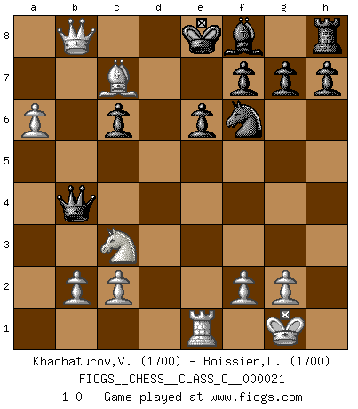 Last move : 1-0 2007 January 11 0:40:52 [Event "FICGS__CHESS__CLASS_C__000021"] [Site "FICGS"] [Date "2006.12.17"] [Round "1"] [White "Khachaturov,Vadim"] [Black "Boissier,Lucien"] [Result "1-0"] [WhiteElo "1700"] [BlackElo "1700"] 1.e4 c5 2.Nf3 d5 3.exd5 Qxd5 4.Nc3 Qh5 5.Be2 Bg4 6.O-O Nf6 7.h3 Bd7 8.d4 cxd4 9.Nxd4 Qa5 10.Bf3 Nc6 11.Nxc6 bxc6 12.Re1 Rd8 13.Bf4 Qb6 14.a4 Bxh3 15.Qe2 Bd7 16.a5 Qb7 17.Ra3 Be6 18.a6 Qc8 19.Qe3 Bg4 20.Bxg4 Qxg4 21.Rb3 e6 22.Bc7 Ra8 23.Rb8+ Rxb8 24.Qxa7 Qb4 25.Qxb8+ 1-0 Sicilian defense Kingside Castling by player White (move 6) Player White won this chess game. Follow this game move after move (download)Discovered check is the dive bomber of the Chessboard. (Reuben Fine) Er war ein guter Schachspieler, aber ich kann Leute nicht ausstehen, die 'Heil Hitler' rufen (Über Alexander Aljechin). (Miguel Najdorf) No soy una persona materialista y por eso, no resiento la falta o pérdida del dinero. La ausencia de cosas mundanas carece de importancia. Ya que el Ajedrez es una forma en la que puedo ser tan materialista como yo desee sin tener la necesidad de vender mi alma. (Jamie Walter Adams) Votre prénom est 'Tactique', votre deuxième prénom est 'Tactique' et votre nom est 'Tactique'. (Ken Smith) God, you are such an idiot. - Actually, I thought I was more of a jerk. (Gregory House to Stacy Warner, House M.D.)