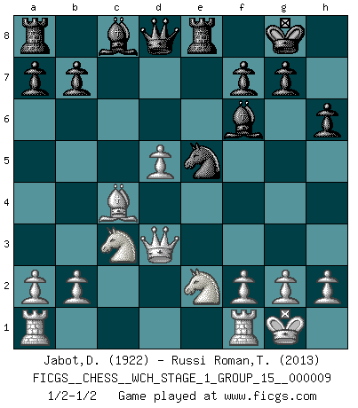 Last move : 1/2-1/2 2011 August 4 11:42:8 [Event "FICGS__CHESS__WCH_STAGE_1_GROUP_15__000009"] [Site "FICGS"] [Date "2011.04.15"] [Round "1"] [White "Jabot,Daniel"] [Black "Russi Roman,Tano-Urayoan"] [Result "1/2-1/2"] [WhiteElo "1922"] [BlackElo "2013"] 1.e4 c6 2.d4 d5 3.exd5 cxd5 4.c4 Nf6 5.Nc3 Nc6 6.Bg5 dxc4 7.d5 Ne5 8.Qd4 h6 9.Bh4 Ng6 10.Bg3 e5 11.Bxe5 Nxe5 12.Qxe5+ Be7 13.Bxc4 O-O 14.Nge2 Ng4 15.Qd4 Bf6 16.Qd3 Re8 17.O-O Ne5 1/2-1/2 Caro-Kann : Panov-Botvinnik attack Kingside Castling by player Black (move 13) Kingside Castling by player White (move 17) This chess game ended in a draw. Follow this game move after move (download)My style is somewhere between that of Tal and Petrosian. (Reshevsky) Ich hatte Zahnschmerzen im ersten Spiel. In der zweiten Partie tat mir der Kopf weh. In der dritten war es eine Rheuma-Attacke und während der vierten fühlte ich mich nicht gut. Und in der fünften? Nun, man muss doch nicht jedes Spiel gewinnen, oder? (Savielly Grigorievitsch Tartakower) Debes de llevar a tu oponente hacia un profundo y obscuro bosque donde 2+2=5, y el camino que conduce a la salida es suficientemente ancho para solamente uno. (Mikhail Tal) Mon pion favori sur ma case favorite ! Bronstein en parlant d'un coup de pion en h5 quand il avait les Noirs. Internet: Absolute communication, absolute isolation. (Paul Carvel)
