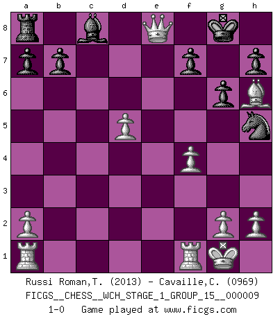 Last move : 1-0 2011 June 14 17:7:28 [Event "FICGS__CHESS__WCH_STAGE_1_GROUP_15__000009"] [Site "FICGS"] [Date "2011.04.15"] [Round "1"] [White "Russi Roman,Tano-Urayoan"] [Black "Cavaille,Cedric"] [Result "1-0"] [WhiteElo "2013"] [BlackElo "0969"] 1.c4 g6 2.Nc3 Bg7 3.e4 Bxc3 4.bxc3 d6 5.Qb3 e5 6.d4 exd4 7.cxd4 c6 8.Nf3 Nf6 9.Bd3 O-O 10.O-O d5 11.cxd5 cxd5 12.e5 Ne4 13.Bh6 Re8 14.Bxe4 dxe4 15.Ng5 Re7 16.Nxe4 Re6 17.d5 Rxe5 18.Qc3 Nd7 19.f4 Qf6 20.Nxf6+ Nxf6 21.Qxe5 Nh5 22.Qe8+ 1-0 English Opening Kingside Castling by player Black (move 9) Kingside Castling by player White (move 10) Player White won this chess game. Follow this game move after move (download)The game of chess is the touchstone of the intellect. (Goethe) Ich erzeugte keinen Neid, da mich die Schachspieler als Musiker und die Musiker als Schachspieler betrachteten. (Mark Taimanov) Bendita sea la memoria de aquel que dio al mundo este juego inmortal. (A. G. Gardiner) L'attaque fait le spectacle, la défense gagne les matchs. (Dicton footballistique) No man has ever achieved immortality in his own life time. (Unknown)