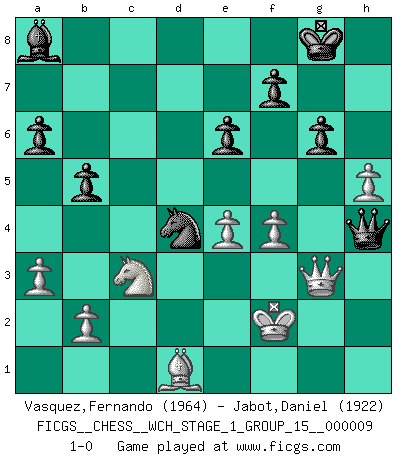 Last move : 1-0 2011 September 29 23:11:57 [Event "FICGS__CHESS__WCH_STAGE_1_GROUP_15__000009"] [Site "FICGS"] [Date "2011.04.15"] [Round "1"] [White "Vasquez,Fernando"] [Black "Jabot,Daniel"] [Result "1-0"] [WhiteElo "1964"] [BlackElo "1922"] 1.e4 c5 2.d4 cxd4 3.c3 dxc3 4.Nxc3 Nc6 5.Nf3 e6 6.Bc4 Nf6 7.Qe2 Qc7 8.O-O Ng4 9.g3 a6 10.h3 Nge5 11.Nxe5 Nxe5 12.Bb3 Bc5 13.Be3 b5 14.Bxc5 Qxc5 15.Rac1 O-O 16.Rfd1 Qb6 17.Kh2 Ng6 18.Rc2 Bb7 19.Rxd7 Rad8 20.Rcd2 Rxd7 21.Rxd7 h5 22.a3 Ne5 23.Rd1 h4 24.gxh4 Qc7 25.Kg1 Qe7 26.Qh5 Qf6 27.Kf1 Nf3 28.Bc2 g6 29.Qc5 Qxh4 30.Kg2 Qf6 31.Qb6 Ba8 32.Qe3 Ne5 33.Bb3 Rd8 34.Rxd8+ Qxd8 35.f4 Nc6 36.Kg3 Nd4 37.Bd1 Qd6 38.h4 Qb6 39.Kf2 Qd8 40.h5 Qh4+ 41.Qg3 1-0 This chess game has been lost on time (started : 2011.04.15 9:24:54) Sicilian : Smith-Morra gambit Kingside Castling by player White (move 8) Kingside Castling by player Black (move 15) Player White won this chess game. Follow this game move after move (download)In a gambit you give up a Pawn for the sake of getting a lost game. (Samuel Standige Boden) Sehr viele beherrschen heutzutage das große Einmalseins des Schachspiels und kennen sogar dessen Logarithmentafeln auswendig - deshalb sollte man hin und wieder zu beweisen trachten, dass zwei mal zwei auch fünf sein kann. (Mikhail Nekhemyevich Tal) Ser exitoso en el Ajedrez te permite descubrir tu propia personalidad. Eso es lo que deseo para los niños de mi clase. (Saudin Robovic) D'abord les bases : Jouez et étudiez, puis étudiez et jouez, ensuite jouez et étudiez, puis étudiez et jouez. Deuxièmement : Donnez toujours le meilleur de vous-même ! (Ken Smith) Computers are like Old Testament gods; lots of rules and no mercy. (Joseph Campbell)