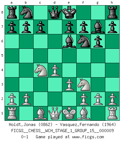 Last move : 0-1 2011 May 24 18:46:24 [Event "FICGS__CHESS__WCH_STAGE_1_GROUP_15__000009"] [Site "FICGS"] [Date "2011.04.15"] [Round "1"] [White "Holdt,Jonas"] [Black "Vasquez,Fernando"] [Result "0-1"] [WhiteElo "0862"] [BlackElo "1964"] 1.d4 d5 2.c4 dxc4 3.Nf3 Nf6 4.e3 Be6 5.Nbd2 g6 6.Nxc4 Bg7 0-1 This chess game has been lost on time (started : 2011.04.15 9:24:54) QGA, Flohr variation Player Black won this chess game. Follow this game move after move (download)Chess is thirty to forty percent psychology. You don't have this when you play a computer. I can't confuse it. (Judith Polgar) Du kannst im Schach nur gut werden, wenn du das Spiel liebst. (Robert James Fischer) Solo los afeminados hacen el Enroque. (Rob Sillars) Pour moi, les échecs ne sont pas un jeu mais un art. (Alexandre Alekhine) The difference between perseverance and obstinacy is that one comes from a strong will, and the other from a strong won't. (Henry Ward Beecher)