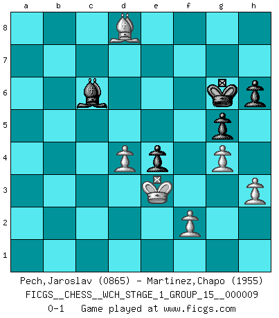 Last move : 0-1 2011 August 12 21:31:36 [Event "FICGS__CHESS__WCH_STAGE_1_GROUP_15__000009"] [Site "FICGS"] [Date "2011.04.15"] [Round "1"] [White "Pech,Jaroslav"] [Black "Martinez,Chapo"] [Result "0-1"] [WhiteElo "0865"] [BlackElo "1955"] 1.d4 Nf6 2.c4 e6 3.Nc3 Bb4 4.e3 O-O 5.Bd3 d5 6.Nf3 c5 7.O-O Nc6 8.a3 Bxc3 9.bxc3 Qc7 10.cxd5 exd5 11.a4 Re8 12.h3 c4 13.Bc2 Ne4 14.Bxe4 Rxe4 15.Nd2 Re8 16.Qf3 Be6 17.Re1 Rad8 18.Ba3 Qa5 19.Rec1 Bc8 20.Nf1 Qc7 21.Re1 Qa5 22.Rec1 Qc7 23.Re1 Na5 24.e4 Nb3 25.Rad1 dxe4 26.Rxe4 Rxe4 27.Qxe4 Qd7 28.Re1 Qxa4 29.Qe7 Qd7 30.Qb4 Qc6 31.Ne3 a5 32.Qe7 Qd7 33.Nxc4 b5 34.Nd6 b4 35.cxb4 Qxe7 36.Rxe7 axb4 37.Bxb4 Be6 38.Bc5 h6 39.Re8+ Rxe8 40.Nxe8 f5 41.Nd6 g5 42.Kf1 Nd2+ 43.Ke1 Ne4 44.Nxe4 fxe4 45.Ke2 Bd5 46.Ke3 Bc6 47.g4 Kg7 48.Bb6 Kf6 49.Bd8+ Kg6 0-1 This chess game has been lost on time (started : 2011.04.15 9:24:54) Nimzo-Indian : 4.e3 O-O, 5.Bd3 d5 Kingside Castling by player Black (move 4) Kingside Castling by player White (move 7) Player Black won this chess game. Follow this game move after move (download)I still hope to kill Fischer. (Boris Spassky) Über die Verhaftung Bobby Fischers: Warum es die Bush-Administration für nötig befindet einen 61 Jahre alten Mann zu hetzten, der für niemanden ausser sich selbste eine Gefahr darstellt ist ein Rätsel. (Nigel Short) En la vida, como en el Ajedrez, los Peones propios obstruyen nuestro camino. La gran fortuna de un hombre, su comodidad, placer, hijos, libros, que deberían ayudarle a ganar, con mucha frecuencia lo ponen en Jaque Mate. (Charles Buxton) Si rien de grave n'est détecté lors de l'analyse d'une position, on joue alors le coup. Seconde règle de Blumenfeld. Unless I accept my faults I will most certainly doubt my virtues. (Hugh Prather)