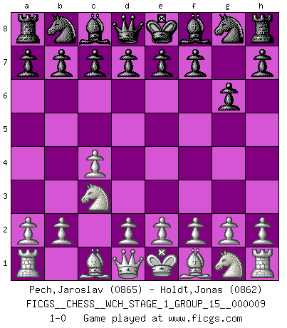 Last move : 1-0 2011 June 4 19:14:36 [Event "FICGS__CHESS__WCH_STAGE_1_GROUP_15__000009"] [Site "FICGS"] [Date "2011.04.15"] [Round "1"] [White "Pech,Jaroslav"] [Black "Holdt,Jonas"] [Result "1-0"] [WhiteElo "0865"] [BlackElo "0862"] 1.c4 g6 2.Nc3 1-0 This chess game has been lost on time (started : 2011.04.15 9:24:54) English Opening Player White won this chess game. Follow this game move after move (download)The enormous mental resilience, without which no Chess player can exist, was so much taken up by Chess that he could never free his mind of this game. (Albert Einstein) Mein erstes Ziel war nicht, die Partie zu gewinnen, sondern eine Figur zu opfern. -- der junge (Wilhelm Steinitz) Solo los afeminados hacen el Enroque. (Rob Sillars) Ne tendez aucun piège pour le plaisir ! Ne jouez rien dans l'espoir que l'adversaire réagisse de façon stupide ! Prenez toujours pour acquis que l'adversaire va trouver le meilleur coup ! Ne jouez jamais de coup dans l'espoir que l'adversaire ne voie pas la menace ! Chacun de vos coups doit améliorer la position d'une façon ou d'une autre. A proverb is a short sentence based on long experience. (Miguel de Cervantes)