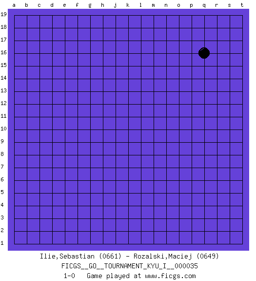 Last move : 1-0 2011 May 16 18:13:54 [Event "FICGS__GO__TOURNAMENT_KYU_I__000035"] [Site "FICGS"] [Date "2011.04.16"] [Round "1"] [Black "Ilie,Sebastian"] [White "Rozalski,Maciej"] [Result "1-0"] [Rating 1 "0661"] [Rating 2 "0649"] 1.q16 1-0 This go game has been lost on time (started : 2011.04.16 13:33:59) Here are the names of the openings (joseki) played in the four corners : Player Black won this Go (weiqi, baduk) game. Follow this game move after move (download)Extend one hand from the cutting points. (Anonymous) Good luck. You're gonna need it. (Han Solo in Star Wars ep.6)